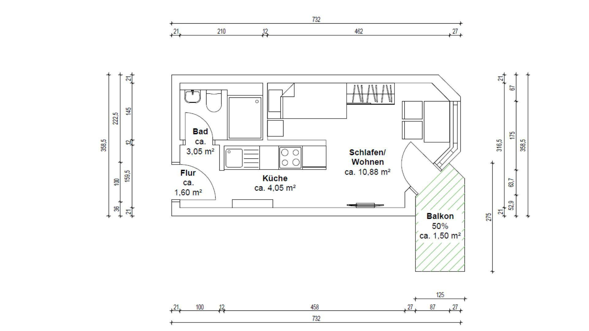 The layout is designed so that living, sleeping, working, and dining areas are comfortably and functionally integrated, despite the compact size. The apartment is fully furnished and therefore ready to move into immediately – ideal for students, doctoral candidates, lecturers, and young professionals.