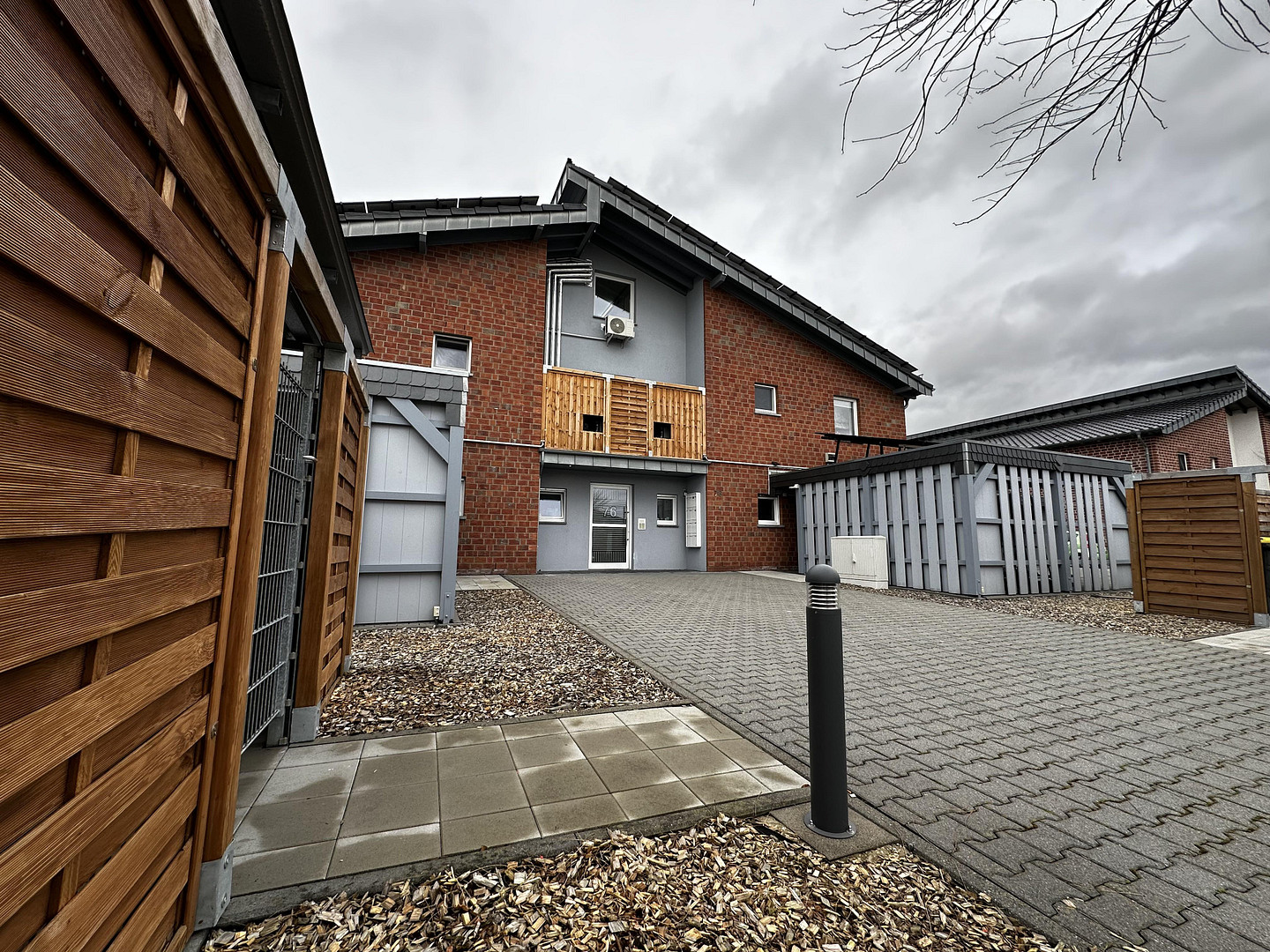 The building was constructed in 2013 and completed in 2014. It comprises a total of eight residential units, with four units on each of the two floors. The building does not have a basement and is equipped with an elevator serving the ground floor and the first floor. To the left and right of the building, there are five carports each, equipped with shared electric vehicle charging stations. Billing is based on usage and individual chips. Furthermore, the carports are secured with Ring surveillance cameras. To the left of the entrance is a bicycle storage area, and to the right is the enclosure for the garbage bins.