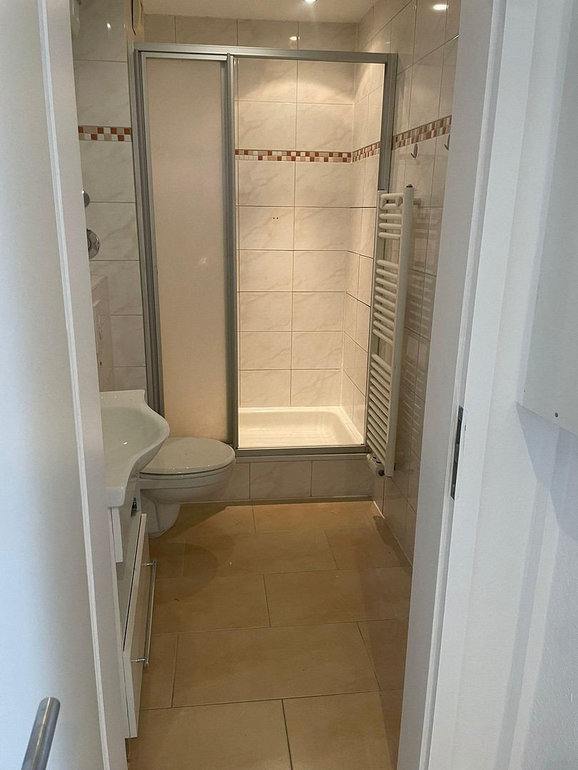 The shower room is modernly equipped and features new bathroom furniture (a cabinet and a mirror), which are included with the apartment. There is no built-in kitchen, allowing the tenant to design the kitchen according to their own preferences.
