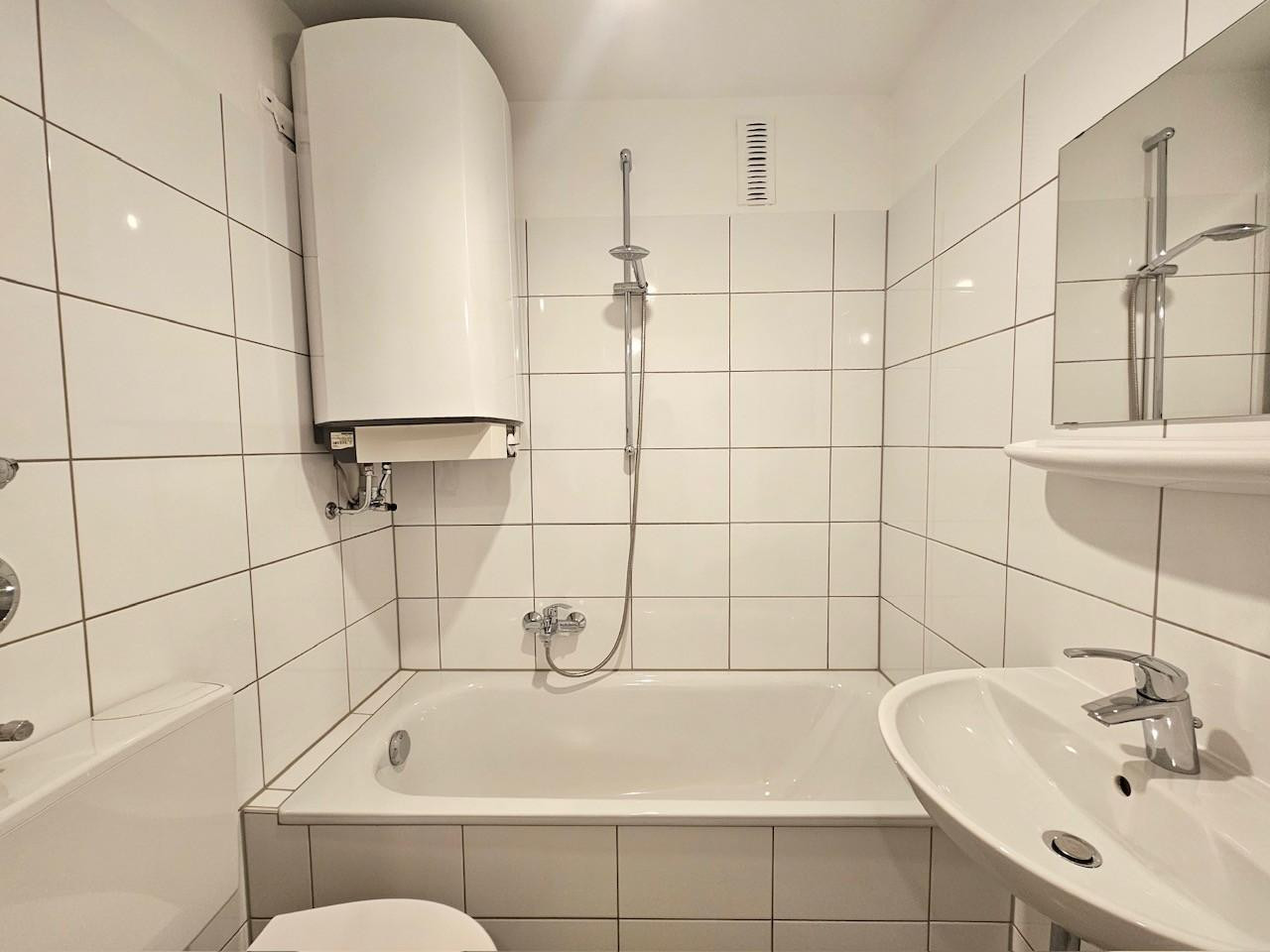 Wooden-look flooring, a small entrance area with a kitchenette, and a bathroom with a bathtub (tiled in white). Balcony overlooking the backyard.