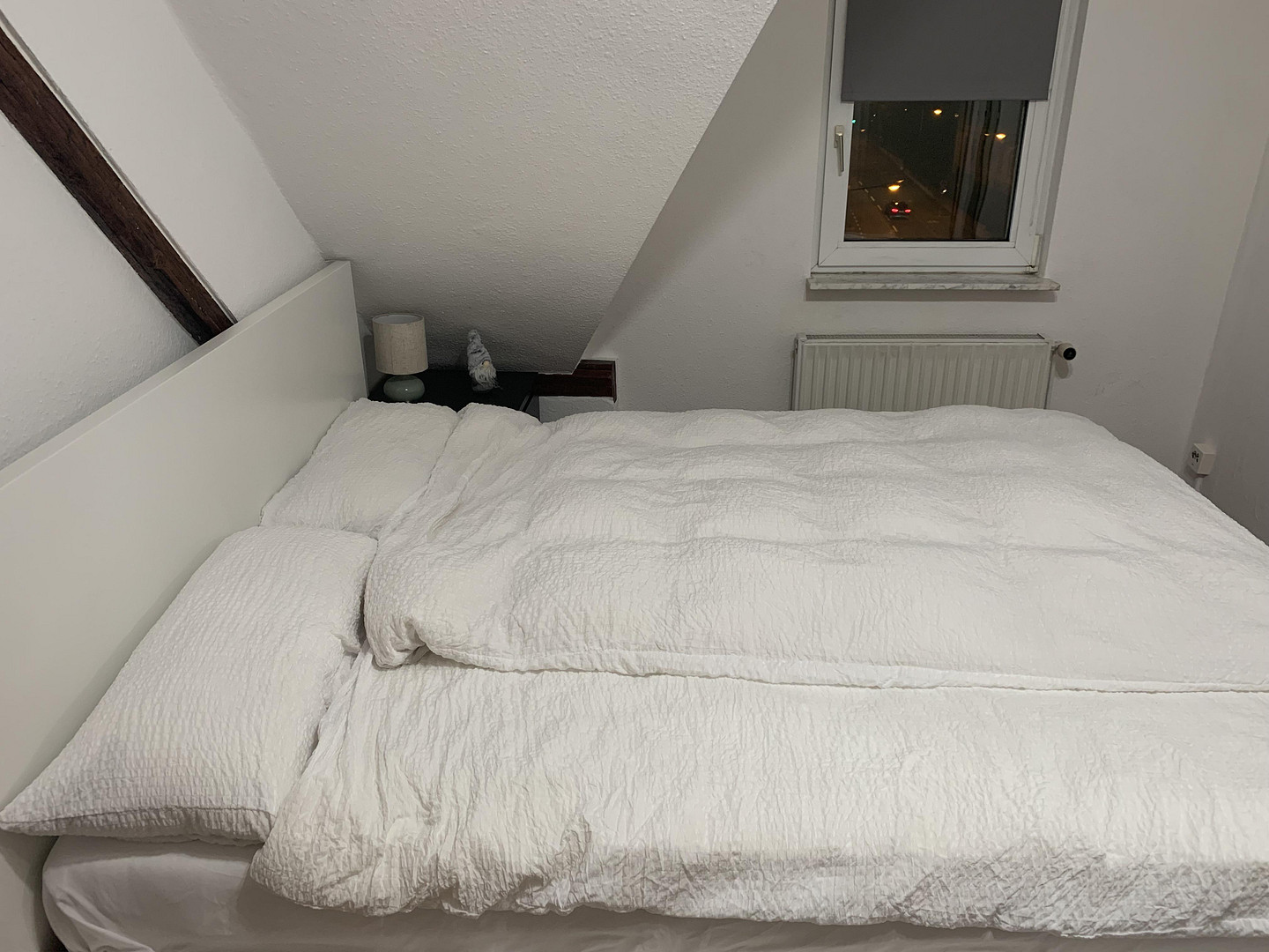 Schiersteiner Str. 88, 65187 Wiesbaden – HessenThis modern and well-maintained 2-room apartment is located in a central area of Wiesbaden. Situated on the 4th floor of a listed apartment building, it benefits from its top-floor location, offering an added advantage: an exclusive attic space accessible only from the apartment. From the hallway, on the right-hand side, you'll find the kitchen, which features a built-in kitchen including appliances and a dining area. Opposite the kitchen is the cozy living room, which is particularly striking due to its exposed roof beams. Thanks to the efficient layout, there is also ample space for a home office area. The bedroom offers enough space for a 1.60m bed and a large wardrobe. It also includes a desk and chair, making it ideal for students. The bathroom was recently renovated in 2023 and also features exposed wooden beams as a special highlight. It is equipped with a shower. A washing machine is also available. The apartment is ideal for a couple or for two students as a shared living space. This modern and well-maintained one-bedroom apartment is located in the city center of Wiesbaden. Situated on the top floor of a listed apartment building, it offers a unique advantage: additional attic space accessible only from within the apartment. From the hallway, you enter the kitchen on the right, which features a built-in kitchen with electrical appliances and a dining area. Opposite is the cozy living room, notable for its exposed wooden ceiling beams. Thanks to the efficient layout, there is also ample space for a home office area. The apartment is ideally suited for a couple or for two students sharing accommodation. Please let us know in advance if you require a second bed and a second desk. A baby cot can also be provided upon request.