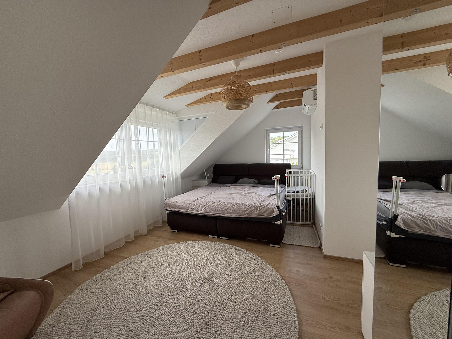 The house was built in 2003 and extensively renovated in 2021. The bathrooms, floors, kitchen, doors, and the master bedroom were all updated with high-quality materials, and an air conditioning system was installed on the upper floor. In addition, the house features a modern photovoltaic system with 19 solar panels, which helps to reduce energy costs. Underfloor heating provides comfortable warmth and added living comfort in the bathrooms and living areas. Electric blinds on all windows offer convenience, security, and optimal light control throughout the house. The gas heating system was completely replaced in 2023 with a significantly more efficient system. On the main living floors (ground floor and first floor), there is beautiful oak parquet flooring, as well as light natural vinyl flooring. The custom-built kitchen with a stone countertop and high-end appliances leaves nothing to be desired. The cozy fireplace in the living room perfectly complements the comfortable living atmosphere. With a total of 6 rooms, the house offers flexible layout options. The bright living room with its open fireplace and direct access to the terrace is the heart of the home. The garden is ideal for families with children, or for creating a private relaxation area. Upstairs, you will find a large bedroom, a children's room, and a spacious bathroom with a walk-in glass shower, double sinks, and high-quality fixtures. Both rooms have modern air conditioning systems (installed in 2021) and vinyl flooring. On the ground floor, there are two additional rooms that can be used in a variety of ways (e.g., office, hobby room), a second full bathroom, and a practical utility/technical room. A separate storage room in the basement complements the living space. This southwest-facing garden offers plenty of sunshine, tranquility, and a picturesque view of the greenery. Whether you're looking for garden furniture, children's play equipment, a vegetable garden, or a wellness area, this outdoor space has it all.