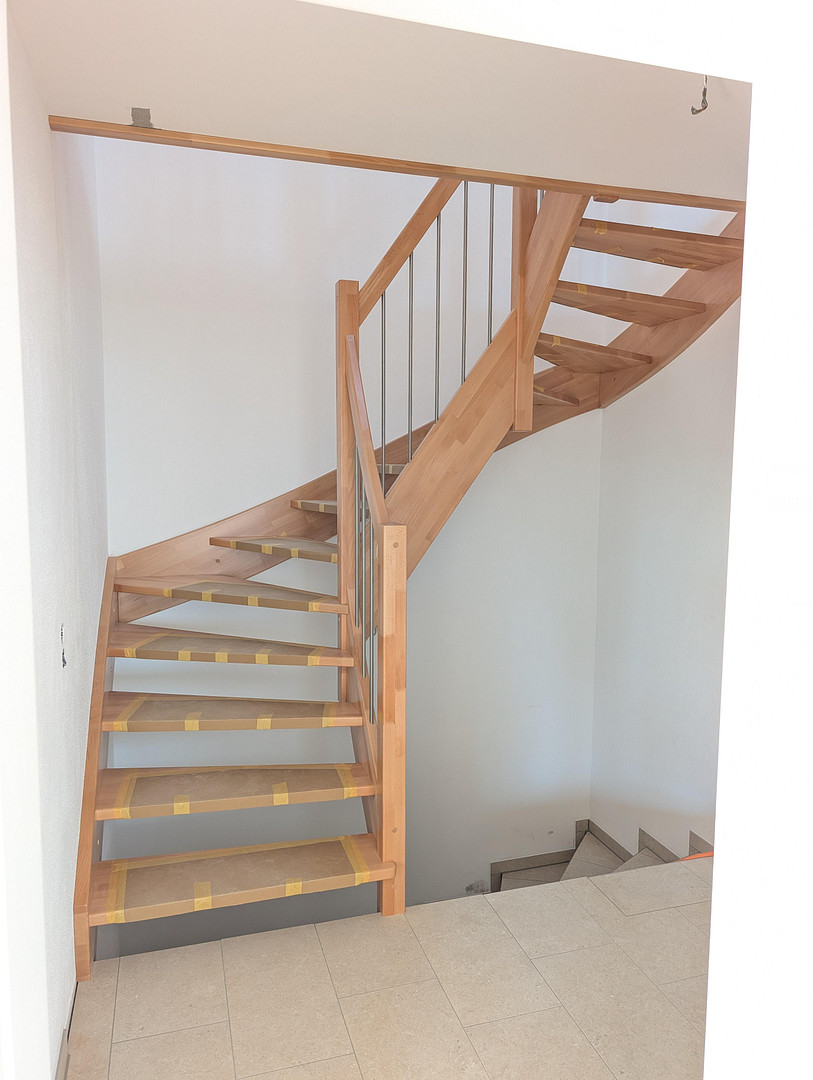 An open spiral staircase made of varnished beechwood leads you to the upper floor. A skylight provides pleasant natural light. Three bedrooms, each approximately 15 m², offer a relaxing environment. Another room can be used flexibly, for example, as a dressing room. The bathroom features large-format tiles, a bathtub, a walk-in shower with shelving, two sinks, and a towel dryer. A rimless toilet completes the modern and easy-to-maintain fixtures.