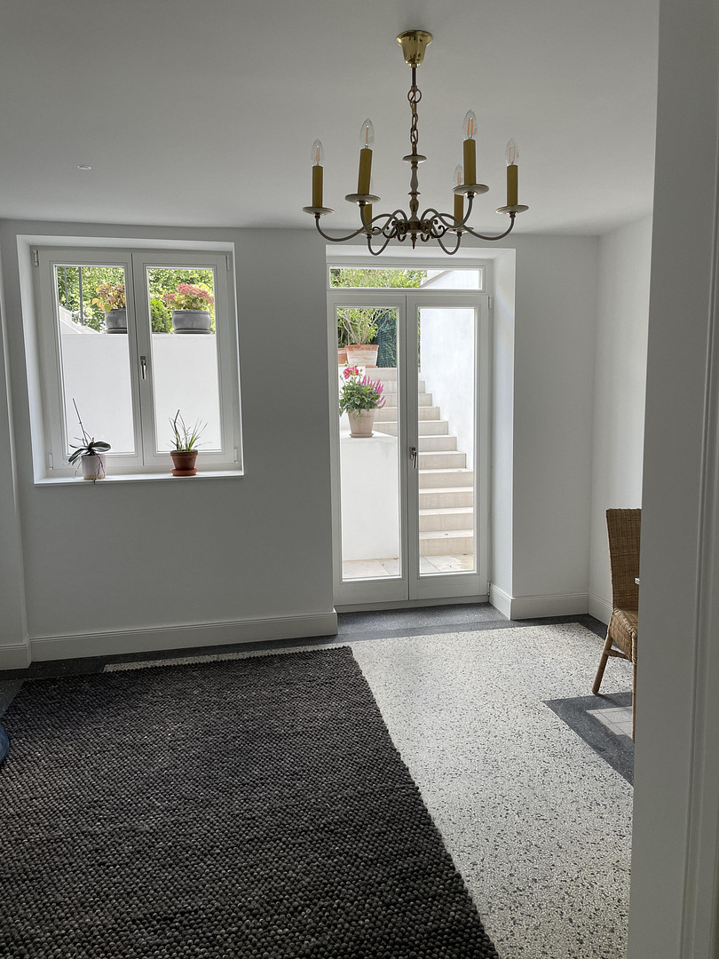 Pitch pine floors, real wood parquet flooring, natural stone bathrooms, smooth plastered walls, food lift, possibility of installing a fireplace, completely renovated in 2017/18 with high-quality materials and meticulous attention to detail. The house is being sold directly by the owner, without any commission.