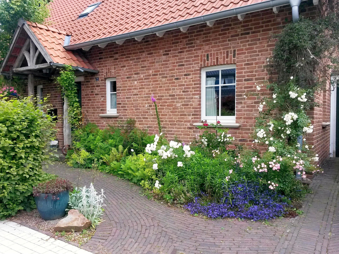 The house features high-quality and sustainable finishes, with many carefully considered details. Oak parquet flooring is installed in all living areas, complemented by healthy materials such as lime plaster and lime paint, which contribute to a pleasant indoor climate. Triple-glazed windows made of larch wood, along with underfloor heating throughout the house, provide comfort and energy efficiency. A sophisticated electrical installation, including LAN cabling in all rooms, is also present. The living area is further enhanced by a water-fed stove with a cooktop and oven, which not only provides cozy warmth but also contributes to hot water production. Many floor-to-ceiling windows, two historical interior doors, and a large arched doorway in the dining/living area give the house a special charm and quality of life. The built-in kitchen is of high quality and features a large, practical double sink, as well as a kitchen island with a 5-burner gas hob by Bosch (a high-current outlet is also available), and a terrazzo work surface. The property is equipped with a forward-thinking energy system: a gas heating system with solar thermal panels, a photovoltaic system with an 8 kWp output, an 8 kWh battery storage system, a wallbox for electric vehicles in the outdoor parking area, and additional hot water production via a water-fed fireplace. A satellite dish is also installed. There is a complete plan with quotes available for a conversion to a heat pump, which can be taken over. The outdoor area is exceptionally well-designed. The large garden features mature trees, hedges, perennial plants, flower beds, numerous herbs, fruit trees, and berry bushes, as well as a pond with a water feature. Raised garden beds and a composting system enable environmentally friendly gardening and eliminate the need for a separate "organic waste" bin. Of particular note is the brick-built and glazed greenhouse with electricity and water connections, as well as a pergola made from historical oak beams, which can be covered with a sun sail in the summer and is then also weatherproof. The garden irrigation system is conveniently provided by a private well with an electric submersible pump, a hand pump, and several water connections, one of which is frost-proof, around the house and greenhouse. This is complemented by a garden shed with space for bicycles and firewood, as well as prepared irrigation lines. Overall, this is a property with very high-quality construction and fittings, which combines comfort, sustainability, and environmentally friendly living in a unique way.