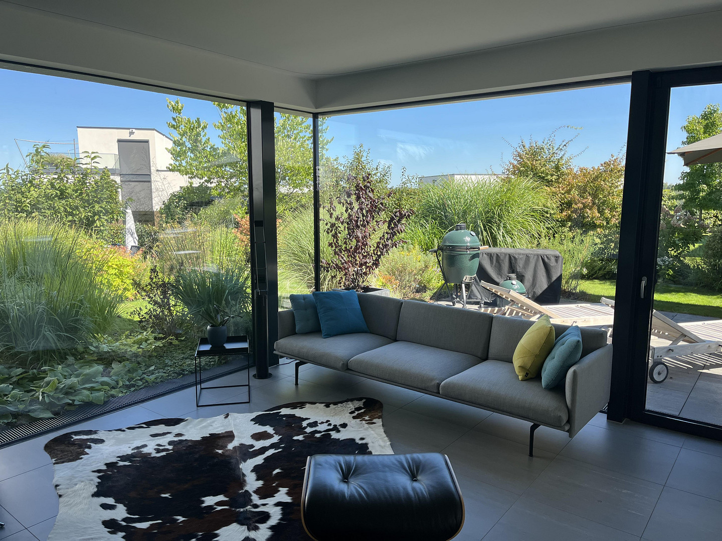 04442 Zwenkau – SachsenAre you looking for an attractive home or an exclusive recreational property? Timeless, spacious, and private? This exceptional property impresses with its clear architectural design and first-class craftsmanship. The precisely designed building presents itself as a modern cube with a minimalist aesthetic, clean lines, and strategically placed windows. Large, floor-to-ceiling windows create a bright, open living space, seamlessly blending the interior and exterior. The four-season garden, designed by a landscape architect, complements the unique character of the property, transforming the outdoor area into a protected and private retreat through carefully selected plantings. The consistent implementation of the timeless architectural concept, with meticulous craftsmanship, is evident in numerous details: frameless glass surfaces, flush-mounted wall and baseboard tiles, a floating concrete fireplace mantel, an elegant folding staircase, and a well-thought-out terrace structure with a glass roof. From here, you can enjoy wonderful views over Lake Zwenkau and the surrounding area, all the way to Leipzig. This property is a place for individuals with a passion for architecture – for people who appreciate an inspiring work environment – for modern families, or an exclusive second home for relaxation, nature, and leisure.