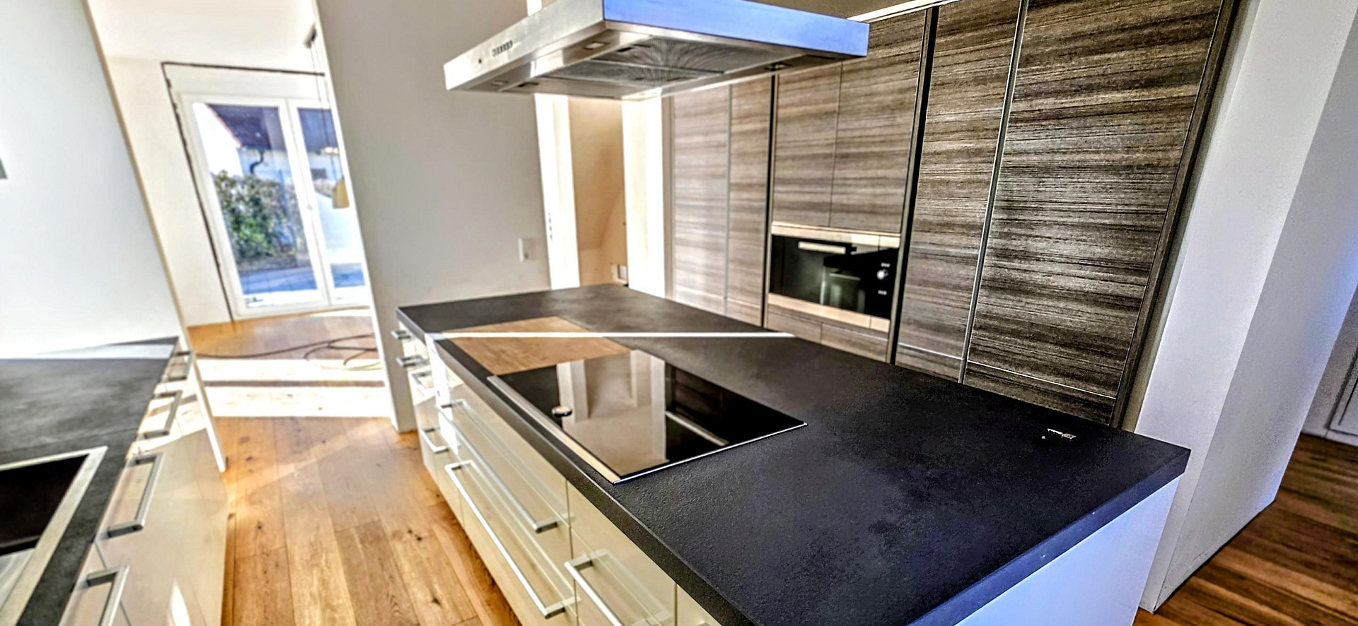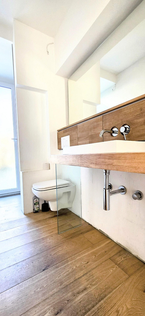 The gourmet kitchen: A Poggenpohl luxury kitchen (furniture value €60,000) with a gigantic cooking island (1.25 m x 2.50 m) forms the centerpiece of the ground floor. Custom-made carpentry: Floor-to-ceiling doors (2.65 m) made of solid 4 cm thick oak wood and handcrafted bathroom furniture emphasize the unique character.