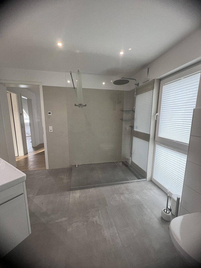 - Large, new tiles with a concrete look in the living area/hallway.