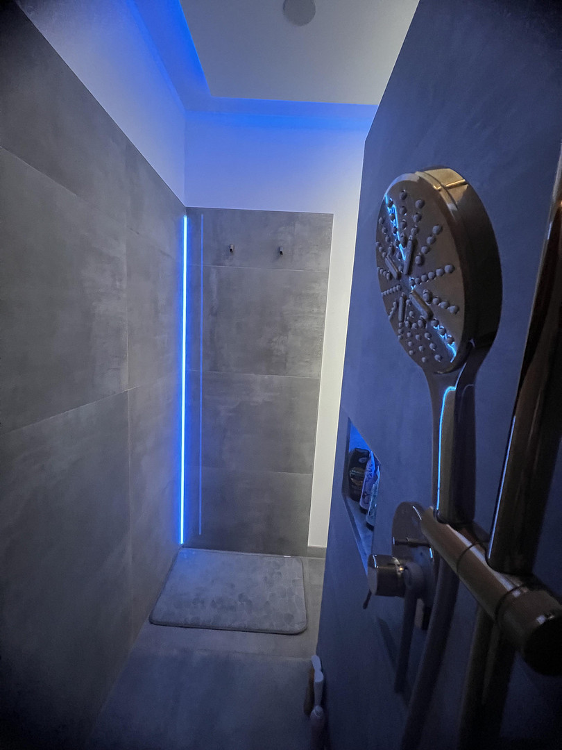 - Recessed ceiling lights, indirect lighting in the bathroom and living area.