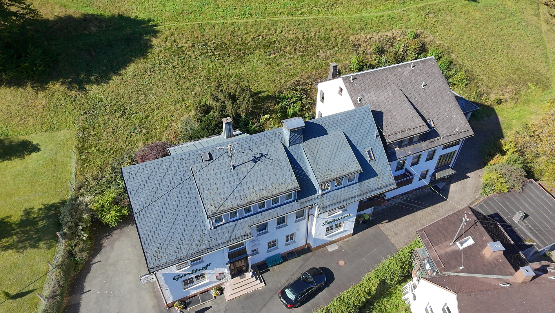 Ground floor: The heart of the property. Here you will find the cozy dining rooms (Frankenwald Room, Bear Room), the fully equipped large kitchen, as well as ancillary rooms (toilets, storage). The warm wooden paneling and rustic atmosphere create a sense of coziness. Upper floors: These floors house the guest rooms of the guesthouse. The rooms vary in size and some are equipped with private bathrooms/toilets. There are 20 guest rooms in total. 14 have private bathrooms, 6 have a sink in the room and a shared bathroom in the hallway. 10 of the rooms have a balcony with views of the surrounding nature. In addition, there is a spacious owner's apartment with a fantastic bathroom. This could continue to be used as the owner's apartment or as an additional source of income in the form of a holiday apartment. Basement: Fully basemented, with a heating system, oil tanks, storage cellars, and cold rooms. The new building also includes toilets for the restaurant, a games room, and a sauna preparation area. Roof: The roof is of high quality, covered with slate, and features copper gutters for drainage. Building Condition: Overall, the building is of high quality, with no visible signs of rising damp.