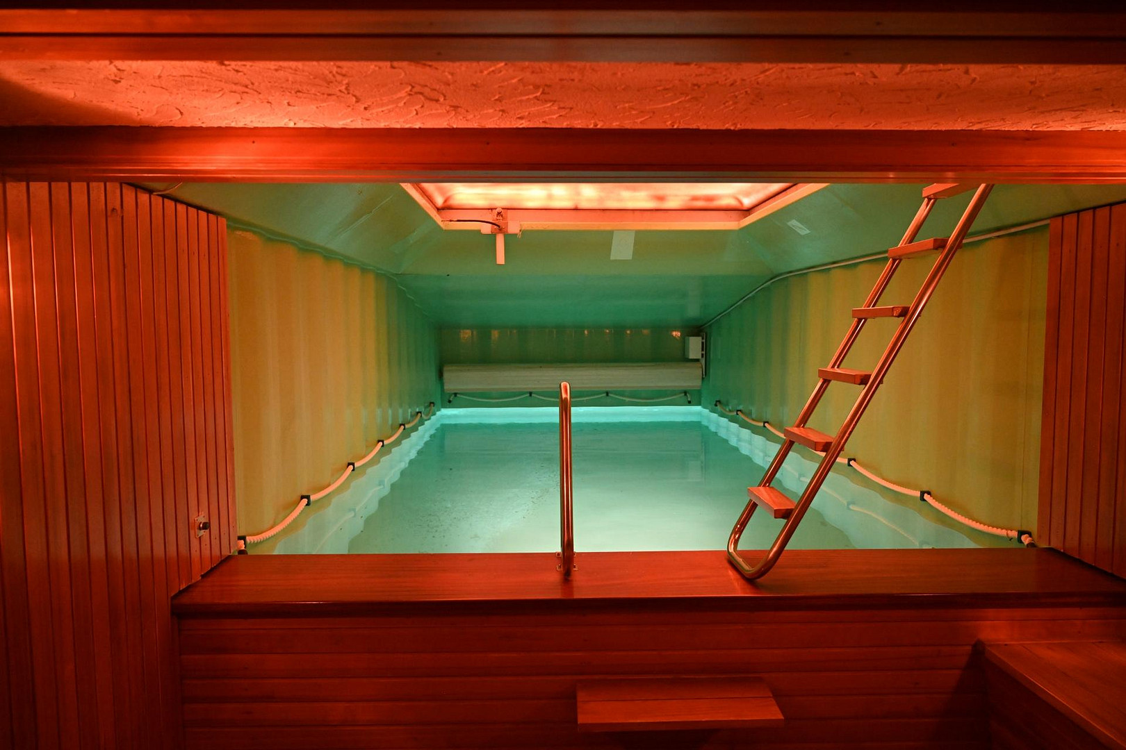 Underground swimming pool with a skylight that can be opened.
