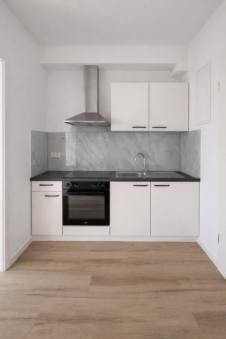Etschberger Weg 49, 66869 Kusel – Rheinland-PfalzThis attractive one-room apartment, with approximately 21 square meters of living space, is located on the ground floor of a multi-family building at Etschberger Weg 49 in Kusel. The apartment has recently undergone a complete renovation and is in like-new condition – available for the first time since the high-quality refurbishment. High-quality vinyl flooring with a wood-grain finish, new windows, and completely renewed electrical and plumbing systems create a modern and well-maintained living environment. The well-designed living and sleeping area offers ample space for individual customization and features a pleasant, quiet atmosphere. The existing lighting and the bright design of the rooms create a friendly and comfortable environment, despite being located on the ground floor. The apartment is complemented by a separate kitchen and a modern bathroom with a walk-in shower. A washing machine connection is also available, adding to the convenience of daily life. This apartment is ideal for singles, commuters, or students looking for a compact, modern apartment with a practical layout and good accessibility. Public parking is available nearby.