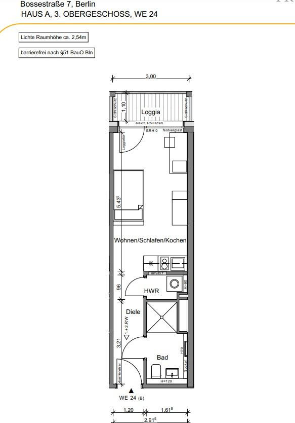 Bossestraße 7, 10245 Berlin (Friedrichshain)This cozy 1-room apartment, with a living area of 30.26 square meters, is located on the 3rd floor of a well-maintained apartment building in Berlin-Friedrichshain. The apartment is easily accessible for people with disabilities and features a balcony with a view of greenery. The high-quality finishes and the elevator in the building provide additional comfort. The apartment comes with a fitted kitchen, making your move-in easier.