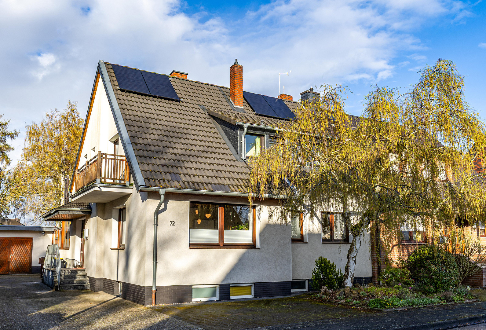 An extension of the building towards the garden (approximately 4 meters) is fundamentally possible and opens up additional design options for future living concepts. This well-maintained and comprehensively modernized house, built in 1963, impresses with its spacious layout, diverse usage possibilities, and an exceptionally beautiful property. The property has been continuously maintained and further developed over many years. In total, approximately €200,000 has been invested in modernizations and improvements. It is particularly worth noting that the building is approved for use as a two-family home. This property offers not only the classic use as a spacious family home, but also the possibility of being divided into two separate living units – ideal for multi-generational living, partial rental, or flexible lifestyle concepts. The ground floor includes a living area, a kitchen with direct access to the terrace and garden, a bathroom, and additional rooms. The upper floor offers additional bedrooms, another modernized bathroom, and access to the rooftop terrace, which provides an additional outdoor space with a high quality of living. The basement is partially finished and includes, among other things, a heated hobby room and additional usable space. The spacious plot of land is a real highlight of the property. The lovingly landscaped garden resembles a park with mature trees and offers an exceptional atmosphere and a high recreational value. The garden, with its swimming pool, terrace, and generous outdoor areas, opens up a variety of possibilities – whether for relaxation, play, or social gatherings. The layout and structure of the property create an exceptionally high level of privacy, giving the impression of a detached house. The outdoor area is complemented by a substantial garden house, which can be ideally used as a pool house, a retreat, or an additional living space. In addition to the garage, there are a total of three further parking spaces available – a clear advantage for families and visitors. There is also a garden fountain.