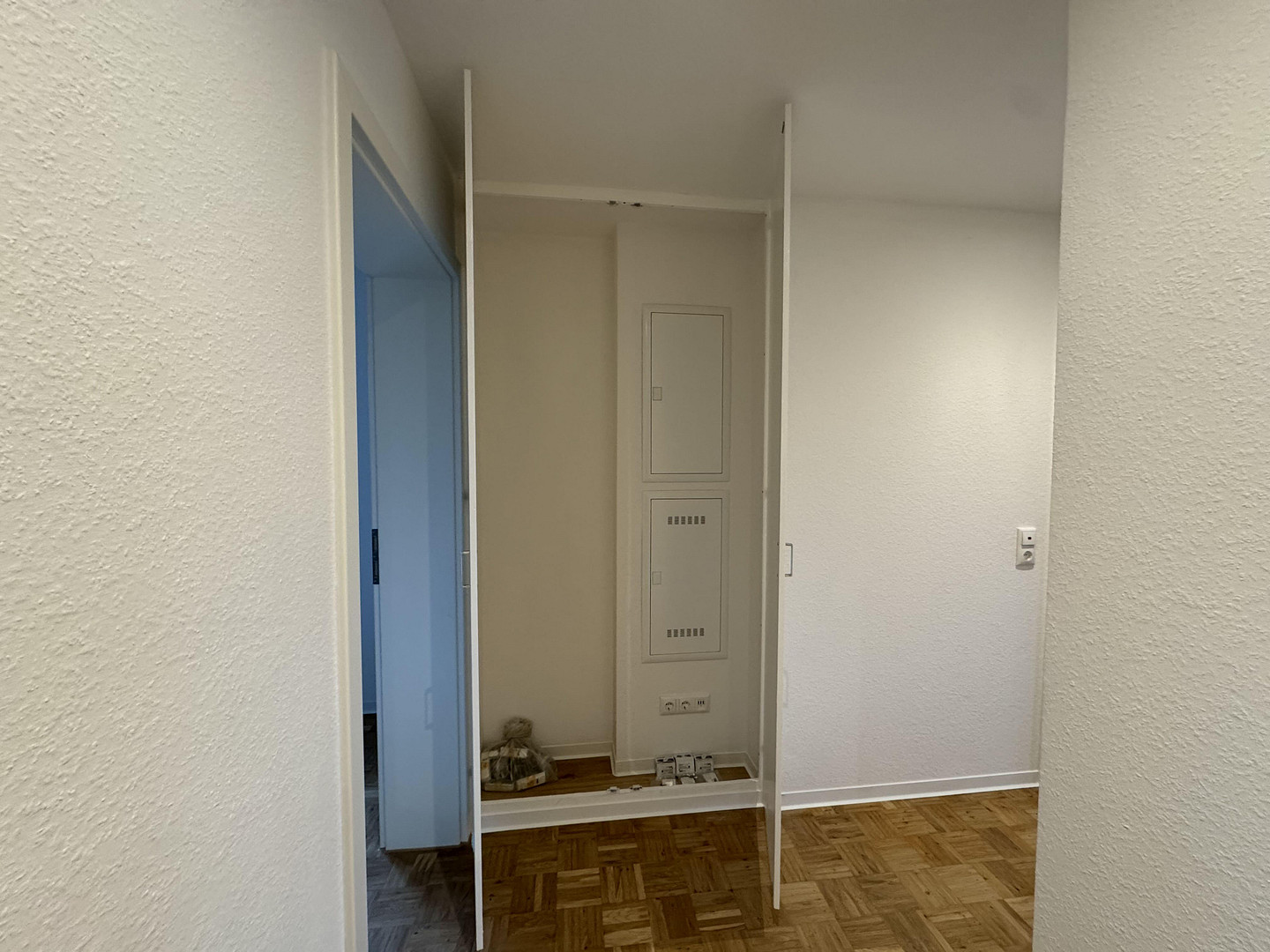 The entrance to apartment building number 31, Ettlinger Straße, is part of a residential complex consisting of four buildings that share a common courtyard and an underground parking garage. The building has an elevator that provides access from the underground garage. The apartment comprises three rooms: a spacious living and dining area with a bay window and an open-plan kitchen, which faces Ettlinger Straße; a bedroom overlooking the courtyard; and a smaller children's room or study, also facing the courtyard. The bedroom also provides access to a balcony. The bathroom, which features a bathtub, is separate from the toilet. The kitchen, bathroom, and toilet all have white tiled walls and gray floor tiles. The living area and the two bedrooms feature newly refurbished parquet flooring. The new, white PVC windows are triple-glazed. All walls and ceilings are covered with a textured wallpaper. As part of the renovation, in addition to the windows, the entire electrical system, radiators, and wall and floor coverings (tiles) will be renewed, and the parquet flooring will be refurbished. A parking space, which is a duplex parking space (a space where cars are parked one above the other), is included with the apartment (75 euros per month). This space can be sublet if needed. There is also a bicycle storage area in the courtyard, as well as a storage room in the basement.