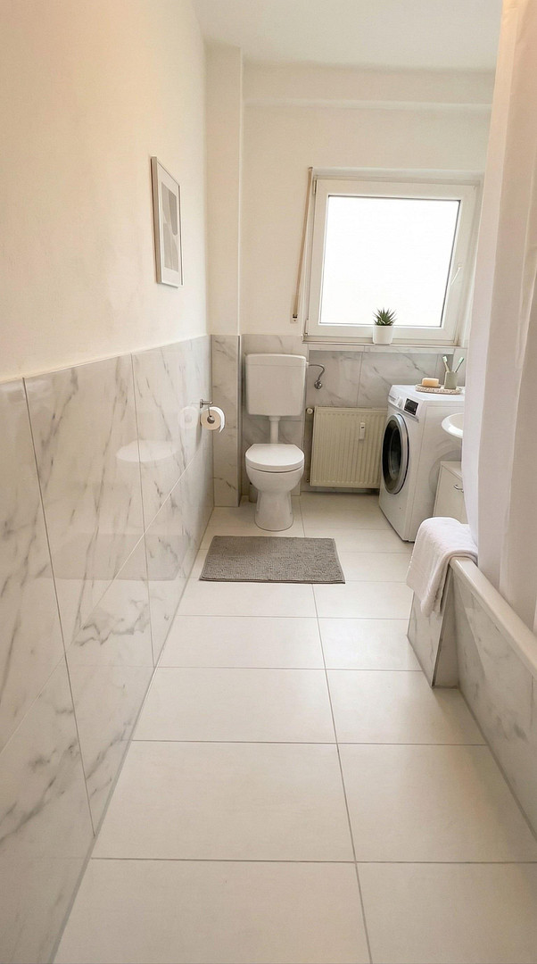 - Bright bathroom, modern, with bathtub & washing machine connection