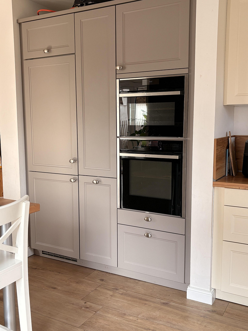 Modern built-in kitchen by Schüller with a kitchen island, steam oven, and oven. Prepared connection for a fireplace in the living area.