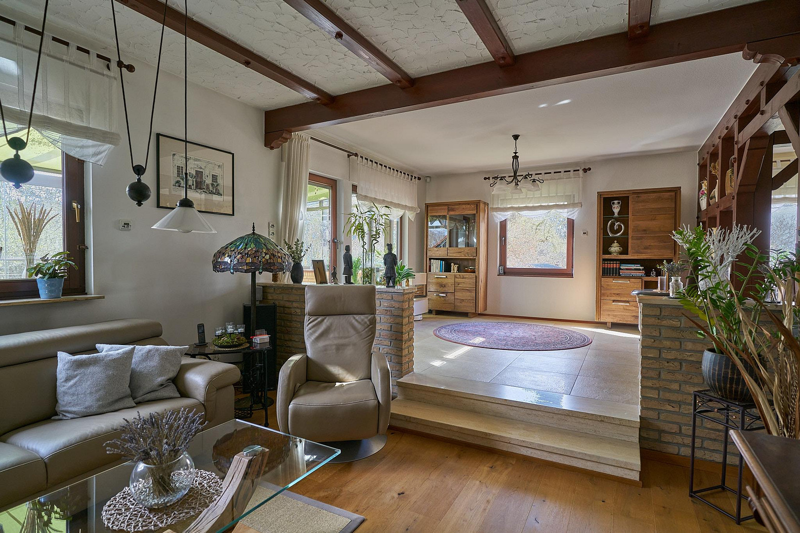 - Open-plan living/dining area with split-level design.