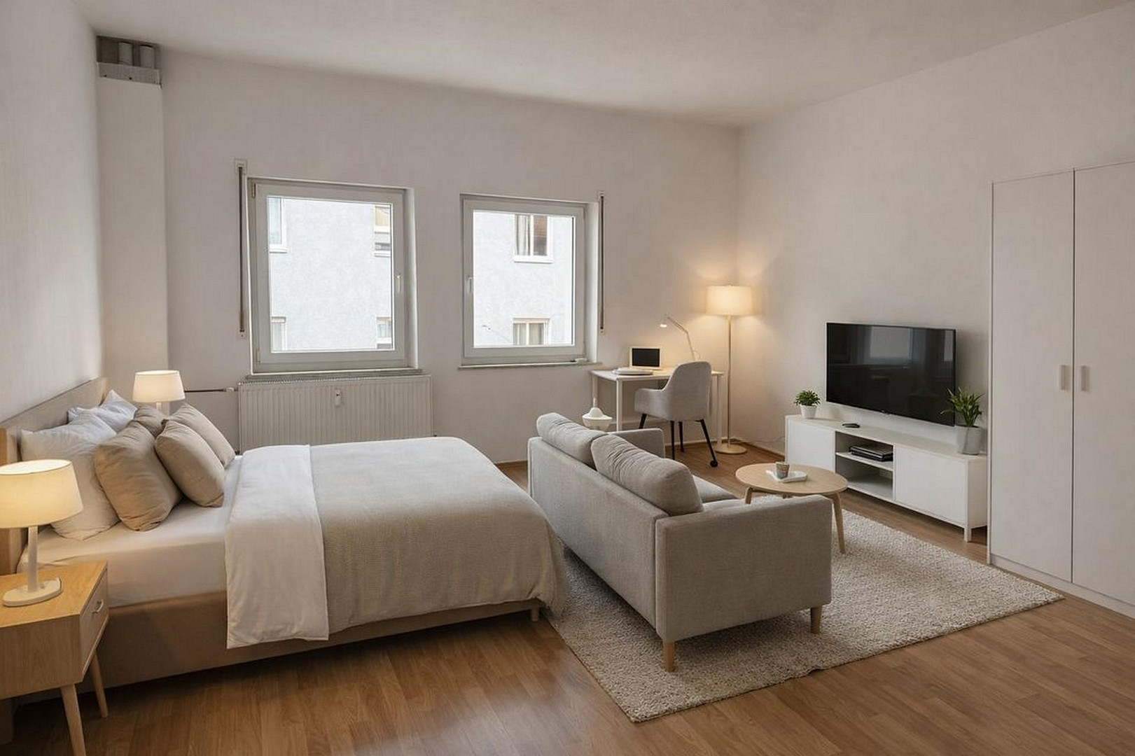 The apartment features a spacious living and sleeping area, a separate kitchen, and a modern bathroom with ample natural light. The living space is bright and well-designed, allowing for a functional arrangement of living, sleeping, and working areas within a single room. Blinds in the living area provide privacy and allow for pleasant darkening.