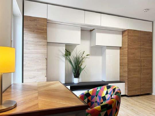 • Includes a sofa bed, desk, built-in cabinets, shelves, and lamps.