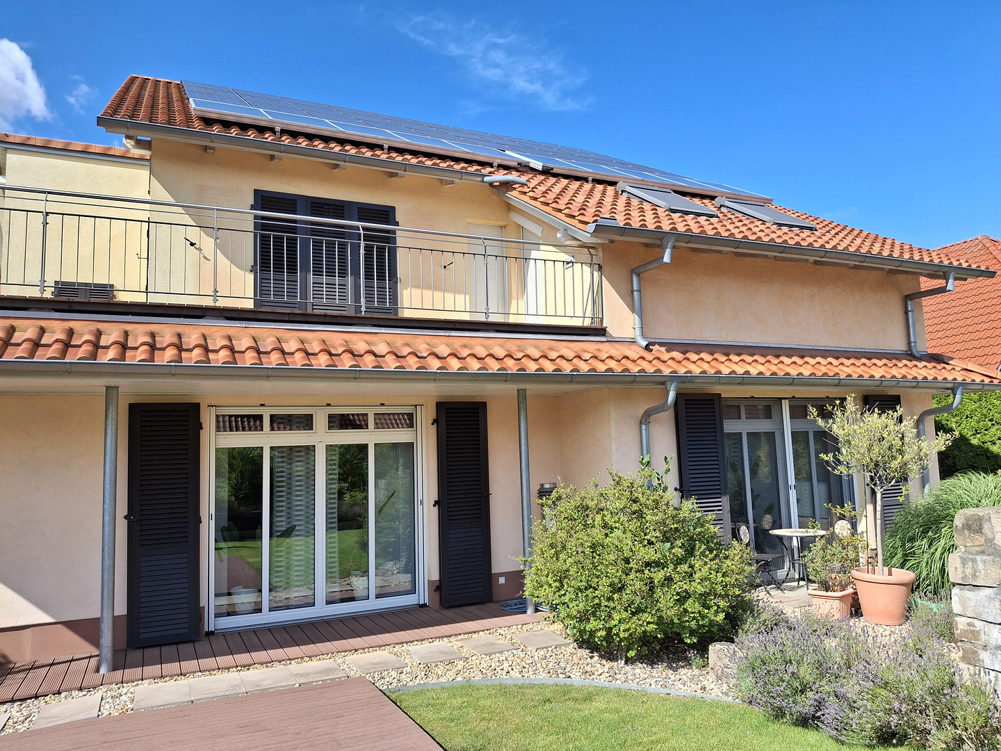 38442 Wolfsburg (Fallersleben) – NiedersachsenDetached single-family house with an attached apartment, a full basement, and a large garage. Energy class A+, with a photovoltaic system and solar panels for hot water. Smart home features. A nearly complete balcony provides access from all rooms and is equipped with lighting and power outlets. The kitchen features an island with sliding elements that can be used to separate the kitchen from the living room when needed. The master bedroom includes a walk-in closet (with lighting) and its own access to the bathroom. The house features underfloor heating, a ventilation system with heat recovery, and a central vacuum system. If needed, the house can be connected to the district heating network. The house has connections for cable TV and fiber optic internet, and also includes a satellite dish. The basement has a ceiling height of 240 cm, is fully heated, and is constructed as a "dry" space. The garage can accommodate two cars, as well as bicycles and gardening equipment. It is also pre-wired for a charging station (wallbox). The driveway is paved with high-quality paving stones and is illuminated. The entire property is enclosed by a fence made of frosted glass elements. The garden includes a patio area, in addition to the veranda in front of the living room. There is also a programmable irrigation system for the entire garden, consisting of drip hoses and a sprinkler system for the lawn. In front of the kitchen, there is a seating area with a view of a fountain.