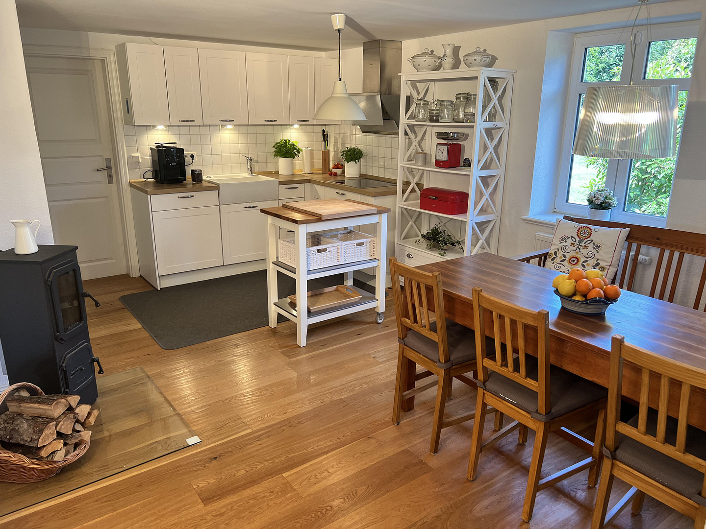 Fireplace/tile stoves (in the kitchen, dining room, and living room).