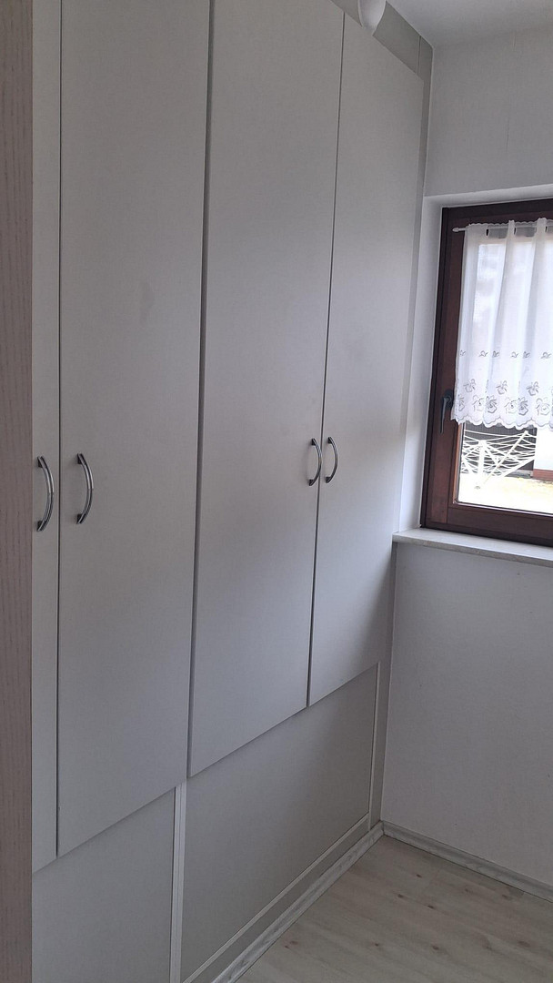 The apartment is equipped with a fitted kitchen and offers additional storage space in the basement, as well as a separate laundry room.