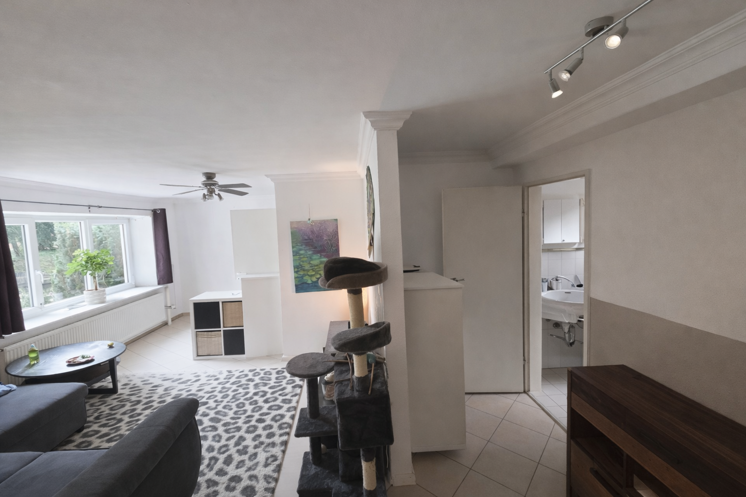 • White laminate flooring in the living room and bedroom.