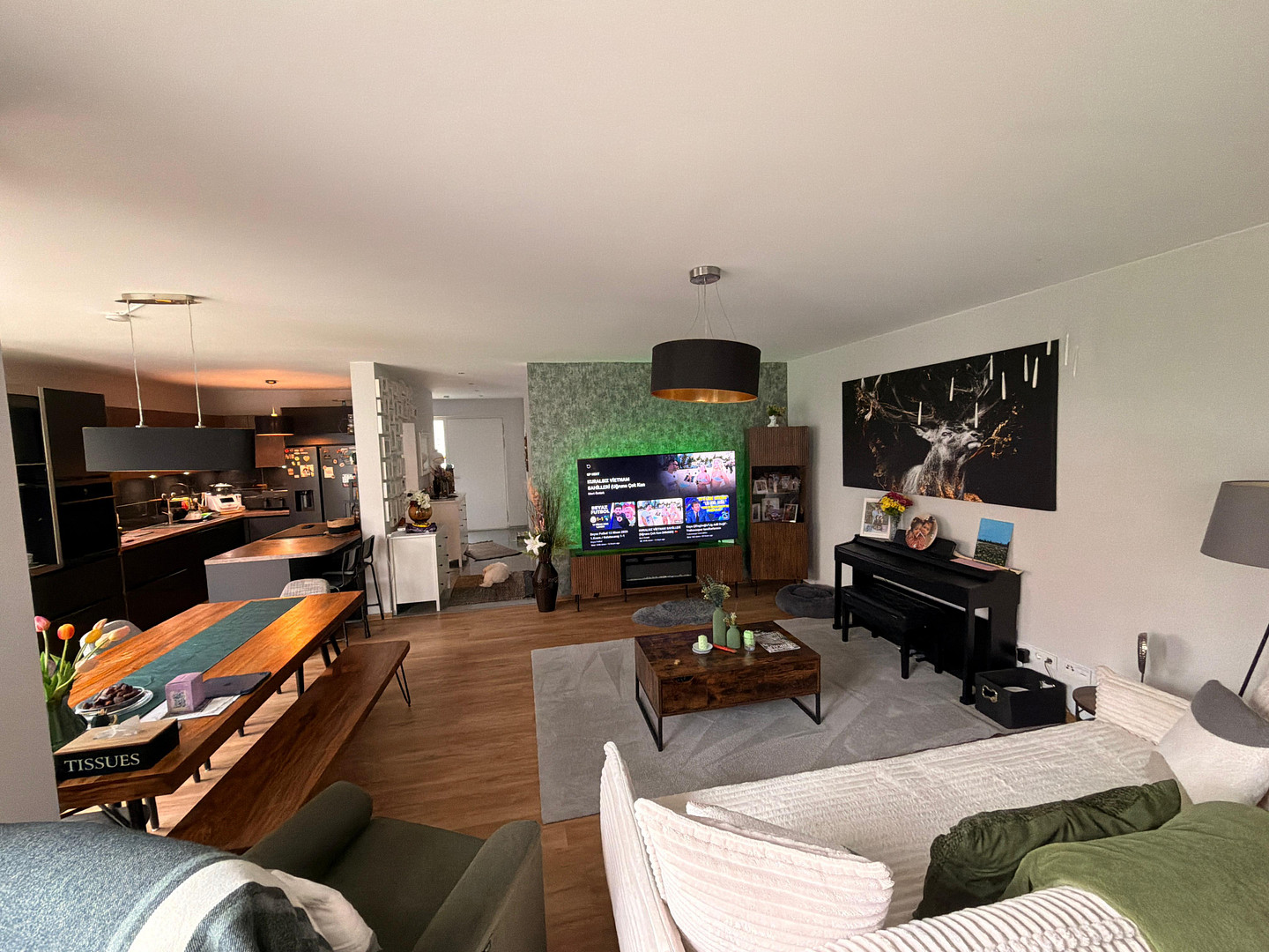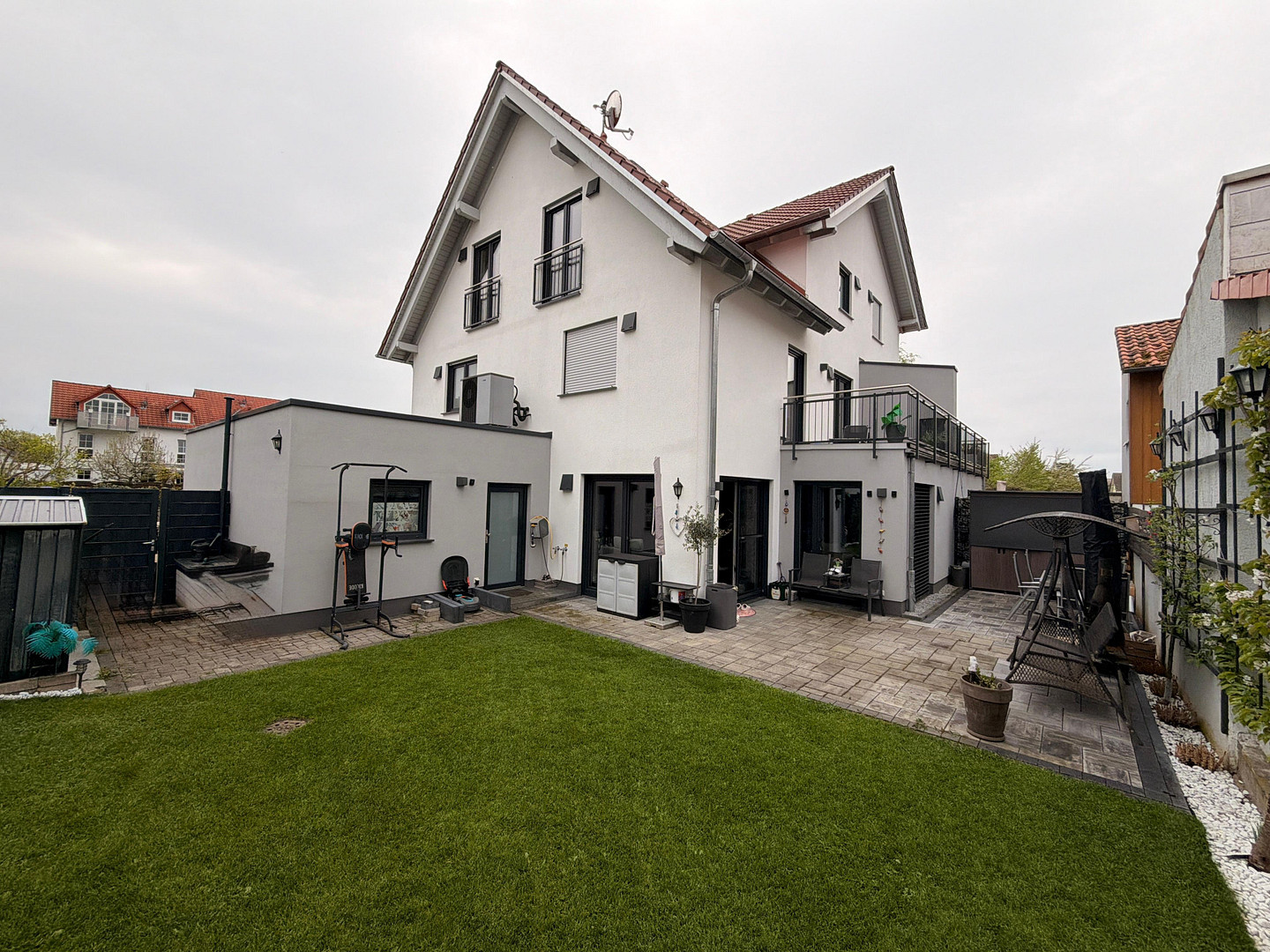 63486 Bruchköbel – HessenThis exclusive semi-detached house, built in 2021, combines modern living with high-quality finishes and energy-efficient technology at the highest level. This stylish home impresses with its well-thought-out layout, bright rooms, and luxurious features, offering ideal conditions for families or couples with discerning tastes. The house extends over three floors and provides generous living space with a variety of uses. Upon entering, you are greeted by an open and inviting living and dining area, characterized by large windows and direct access to the beautifully landscaped garden. The modern, open-plan kitchen blends harmoniously into the overall design and offers plenty of space for cooking and socializing. A practical storage room located next to the kitchen provides additional storage space. On the lower level, there is also a guest toilet. The upper floor features two flexible rooms that are ideally suited as children's rooms, guest rooms, or a home office. This floor is complemented by a stylishly designed bathroom with a modern shower, an additional small room, and access to an insulated attic, which provides further storage space. In the central part of the house, you will find three more bedrooms, which can also be used in a variety of ways. An additional bathroom with a bathtub provides a high level of comfort and offers plenty of space for the whole family. The entire house is equipped with underfloor heating and is heated by a modern heat pump. In combination with the energy efficiency class A+, this not only guarantees a pleasant indoor climate but also low energy costs. The integrated smart home system, electric, fully automated blinds, and a ventilation system throughout the house emphasize the high technical standard of the property and offer maximum comfort in everyday life. In addition to the living area, the house has a separate boiler room and an additional intermediate space with direct access to the garage, which is currently used as a practical shoe storage area. A garage and three additional parking spaces provide ample parking options. The beautifully landscaped garden invites relaxation and enjoyment, and is complemented by a rainwater tank for sustainable irrigation. This property, in excellent condition, impresses with its high-quality construction, modern features, and outstanding energy efficiency, offering a comfortable and welcoming home in every respect.