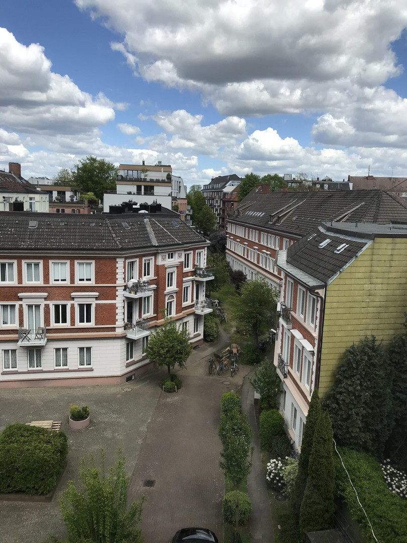 Schrammsweg 21, 20249 Hamburg (Eppendorf)This attractive 4-room apartment is located on the 2nd floor of a building constructed in 1894 and has a very well-designed layout. Two rooms, connected by a classic double-door, face south towards Schrammsweg. The other two rooms overlook the beautiful courtyard. A small storage room and a corresponding attic space are particularly practical. The built-in kitchen features a ceramic cooktop, an oven, and a range hood. The built-in kitchen also includes a space for a refrigerator and connections for a washing machine and dishwasher.