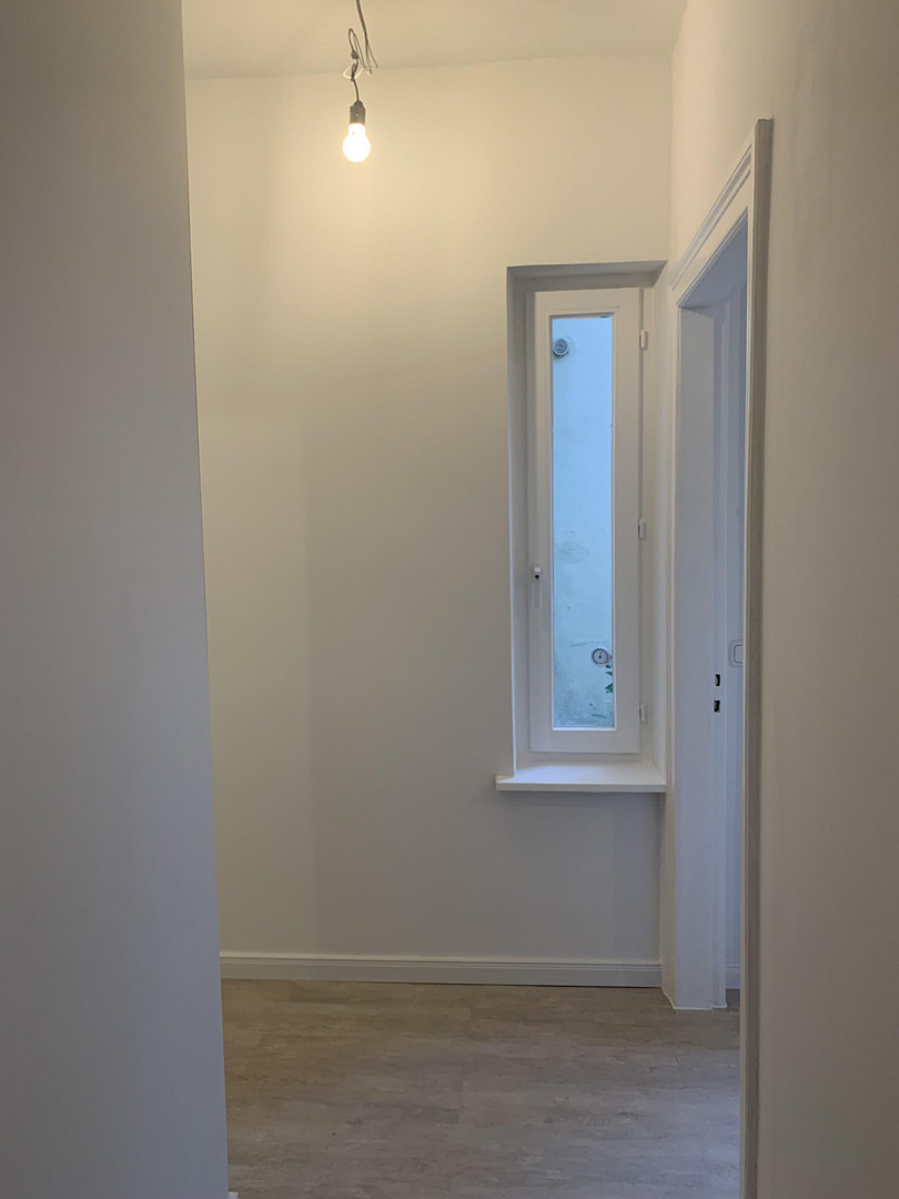The bathroom/WC, with a shower and natural light, is accessed from the hallway. All the rooms are spacious and well-proportioned. It's a very charming apartment with designer flooring, located within the courtyard complex.