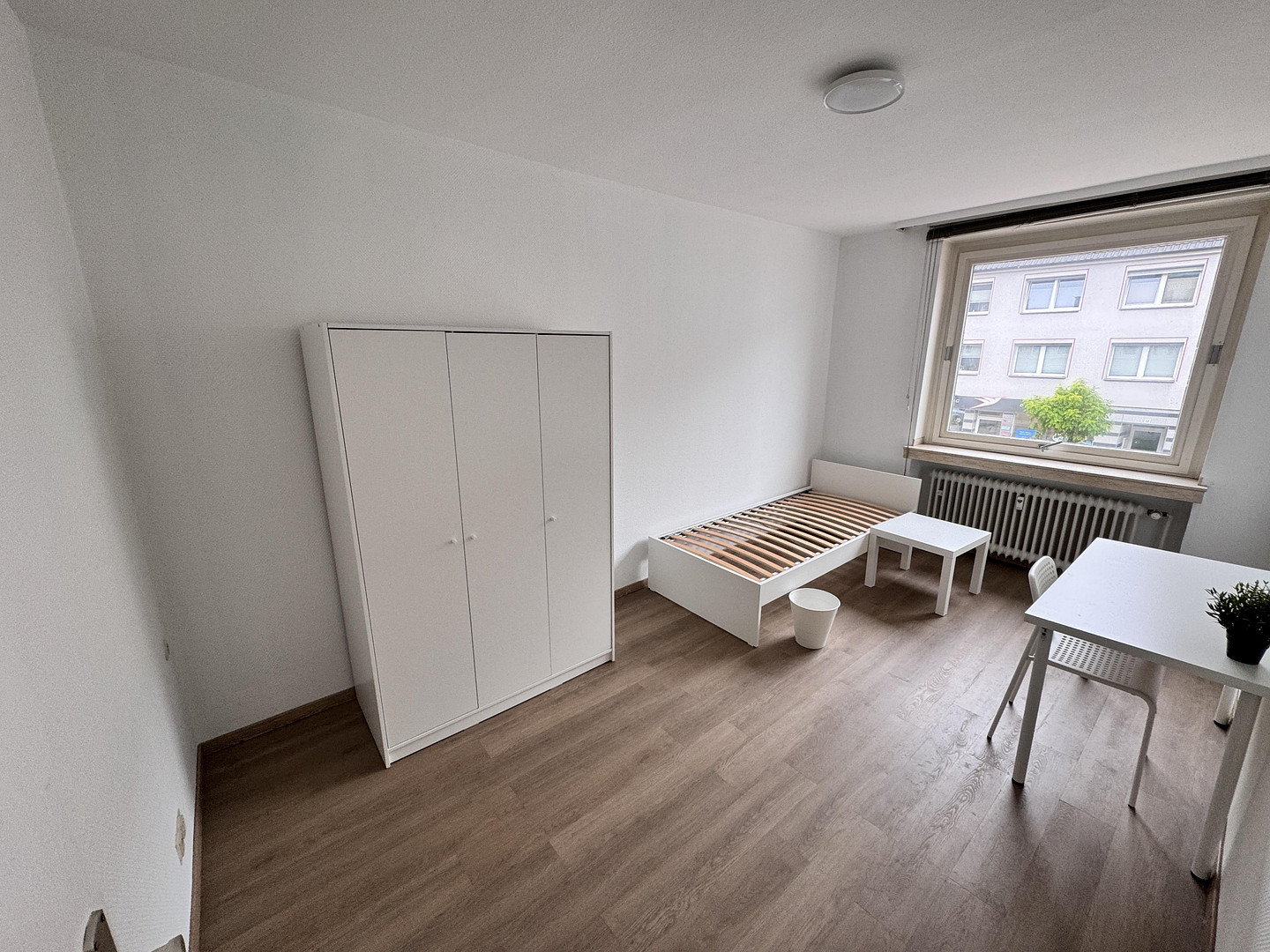 * Fully furnished: bed with slatted frame, nightstand, wardrobe, desk with chair, clothes drying rack.