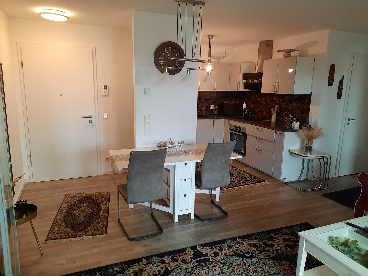 Bahnstraße 78, 41515 Grevenbroich – Nordrhein-WestfalenThe apartment features a living room with an open-plan kitchen, a hallway, a shower room, a storage room, and two spacious bedrooms. It is located on the 3rd floor. The living space is approximately 74.5 m², including a large balcony facing south. The bedroom has ample space for a large bed and a spacious wardrobe. The bathroom features a large shower with a tiled shower base. A washing machine and dryer can be accommodated in the laundry room in the basement. Access to the building and the apartment is barrier-free, and the elevator is easily accessible. The energy-efficient use of geothermal energy via a ground-source heat pump not only provides underfloor heating but also central and cost-effective hot water. The apartment features electric blinds, high-quality sanitary fixtures, network cabling, and tiled floors. The bathroom has tiled flooring, while the remaining rooms have a design floor with a wood-look finish. The apartment is rented in a move-in ready condition, including painting and flooring. In addition to the basement storage space for each apartment, the basement also has a bicycle storage room with charging facilities for e-bikes. An exceptional extra: Tenants have the option to purchase discounted solar power directly from the local photovoltaic system. If needed, a parking space in the courtyard can be rented. Each parking space has a wallbox. The high-quality fitted kitchen can be taken over from the previous tenant for a fee.