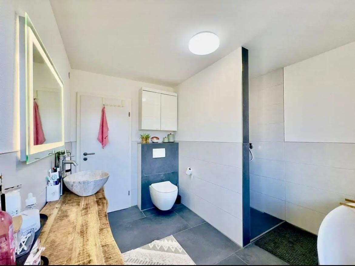 This spacious and stylishly modernized semi-detached house impresses with its well-thought-out layout, high-quality finishes, and a lovingly designed outdoor area with a pool. It offers ideal conditions for families needing space, multi-generational households, or a combination of living and working under one roof. The property is currently owner-occupied and will be available from August 1st, 2026. The house was comprehensively renovated in 2019, 2020, and 2023, with great attention to quality and design. High-quality materials, a timeless design, and a harmonious living concept create a pleasant and modern living environment. Warm bio-vinyl flooring with a vintage oak finish provides comfort in the living areas, while elegant tiles add stylish accents in the entrance area, guest toilet, and bathroom. The walls are predominantly finished with fine plaster, with some areas complemented by tasteful textured wallpaper. During the modernization, the layout was also optimized: strategic openings and the use of steel supports created open, light-filled transitions between the kitchen, dining, and living areas. The modern fitted kitchen was newly installed at the end of December 2019 and is equipped with all necessary appliances. The high-quality bathroom on the upper floor features a walk-in shower and a freestanding bathtub – a place to relax. The guest toilet on the ground floor has a comfortable electric underfloor heating system. A particular highlight is the attic, which was completely renovated in 2023. With its own kitchen and bathroom, it is ideally suited as a separate apartment – perfect for renting or for use by multiple generations. The outdoor area was also redesigned in 2023 and invites you to relax: an integrated pool, a modern pergola, and stylish privacy screens create a private oasis. The property is heated by a reliable oil-fired central heating system from 2007, which can be supplemented by a fireplace in the living/dining area, providing additional comfort. The double-glazed plastic windows with a wood-grain finish are also from this period. All of the property's technical systems are well-maintained and regularly serviced. The quiet and pleasant neighborhood, combined with the central location and easy access to amenities – including schools, kindergartens, doctors, shops, the train station, and cafes – complete this attractive offering.