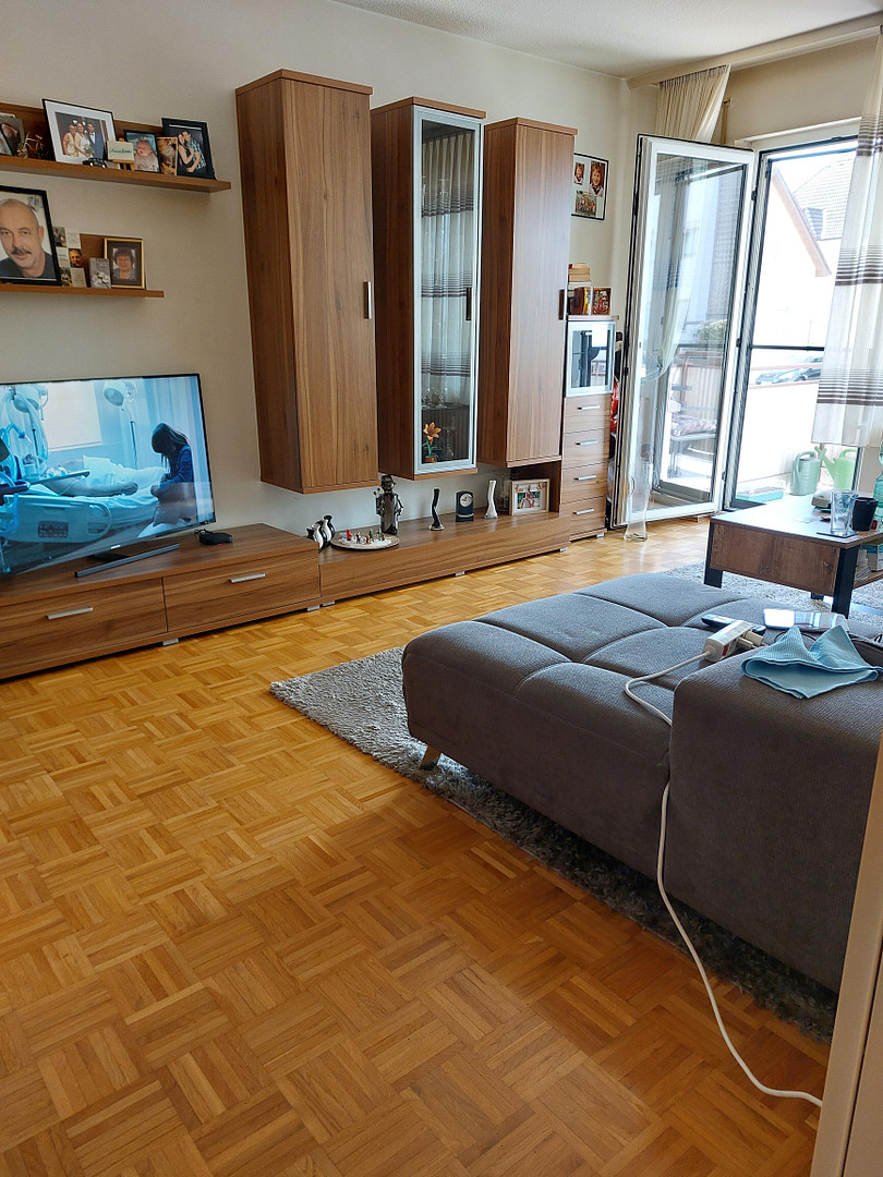 Bright 2-room apartment on a high floor of a well-maintained building with 6 apartments. It features a balcony, a bathroom with a bathtub, and a living room with parquet flooring. The apartment includes a separate storage room in the basement, as well as access to a shared laundry room and drying room. The existing built-in kitchen can be taken over from the previous tenant for €700.