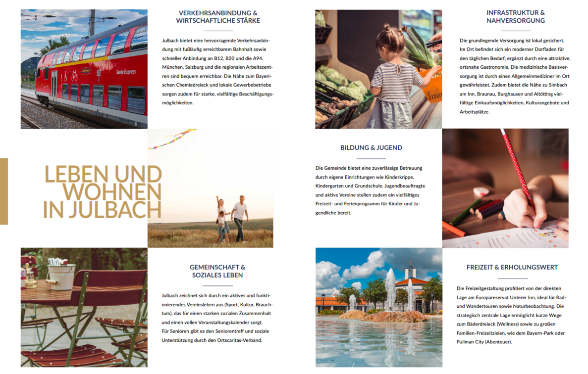 The municipality of Julbach is ideally and idyllically situated in the beautiful Lower Inn Valley, in the southern district of Rottal-Inn (Bavaria). The location offers an excellent balance between rural tranquility and excellent regional connections, making it a desirable place to live for commuters and families. Julbach benefits from its strategically advantageous location between the Bavarian Chemical Triangle (e.g., Burghausen, approximately 20 km away) and the well-known Spa Triangle (Bad Füssing, Bad Griesbach, Bad Birnbach). A particular attraction is the local train station on the Munich–Simbach am Inn line, as well as the proximity to the federal highways B12 and B20 and the A94 motorway. Furthermore, Julbach is centrally located between: