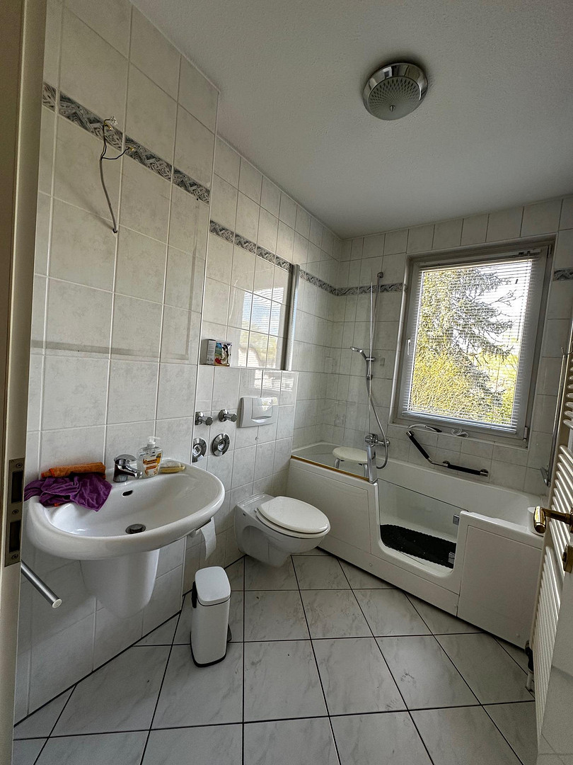 The bathroom features a bathtub with a door for easy access for showering, as well as grab rails. The washing machine is located in the laundry cellar. Clothes are hung to dry in the drying cellar. A bicycle cellar and a large private cellar are included with the apartment.