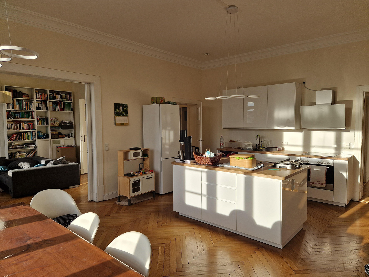 This exceptional 6-room apartment is located in a prestigious Berlin building dating back to 1911, which impresses with its representative entrance area, a beautifully landscaped front garden, and a green courtyard. The well-maintained staircase and an elevator enhance the building's upscale character. The small homeowners' association ensures a pleasant atmosphere – the apartments are primarily occupied by their owners. The building consists of a front section with only two apartments per floor, as well as two side wings, each with only one apartment per floor – a rare level of privacy in the heart of the city. The generously designed apartment offers an ideal home for large families or individuals with space requirements, with its six rooms. Four bedrooms – two of which feature practical loft beds – provide a variety of usage possibilities. The spacious living room, with direct access to the west-facing balcony, offers a wide view of the city and is perfect for relaxing. The living area is complemented by a generous dining room with an open-plan kitchen, which becomes the central hub of daily life. Two bathrooms – one with a shower, one with a bathtub – provide comfort and flexibility. A separate room for the washing machine and dryer adds to the functionality. Notably, the property features exceptionally ample storage space: three hanging shelves, built-in cabinets, as well as a large and a small storage room, creating order and space. Another highlight is the possibility of having two separate entrances to the apartment, both via the staircase of the main building and via the staircase of the adjacent wing. This offers flexible usage options, for example, for multi-generational living or a combination of living and working. The apartment also includes a dry storage space in the basement. Heating is provided by cost-effective district heating. Optionally, two separate underground parking spaces, each with its own land registry entry, can be purchased.