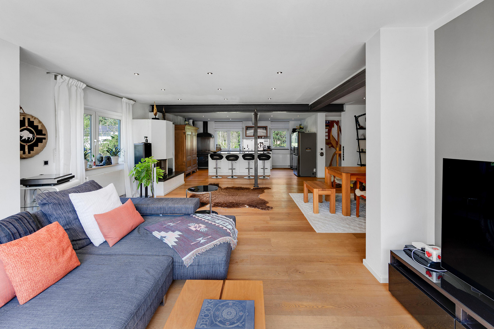 - Wooden flooring on the upper floor (except in the bathrooms).
