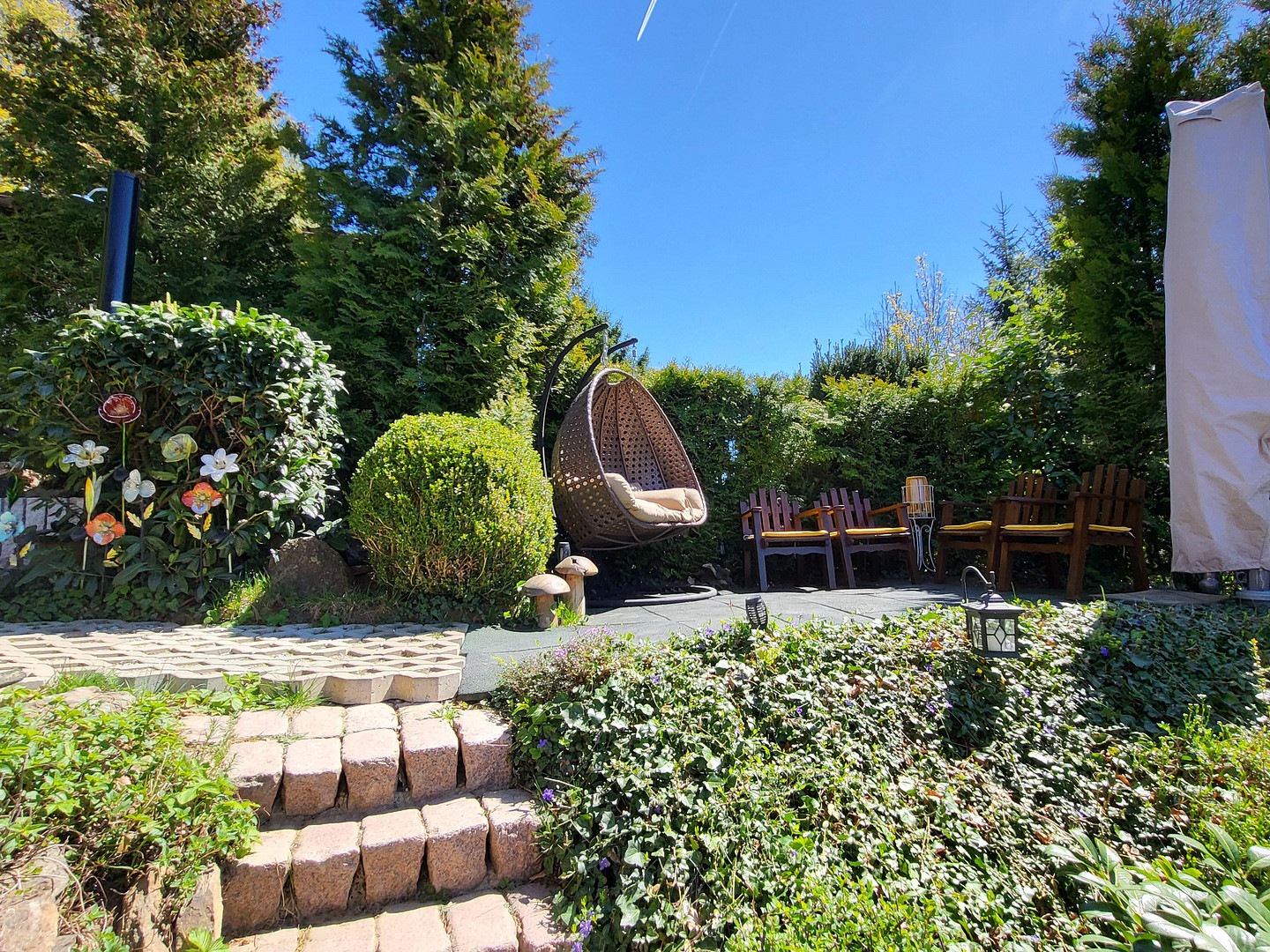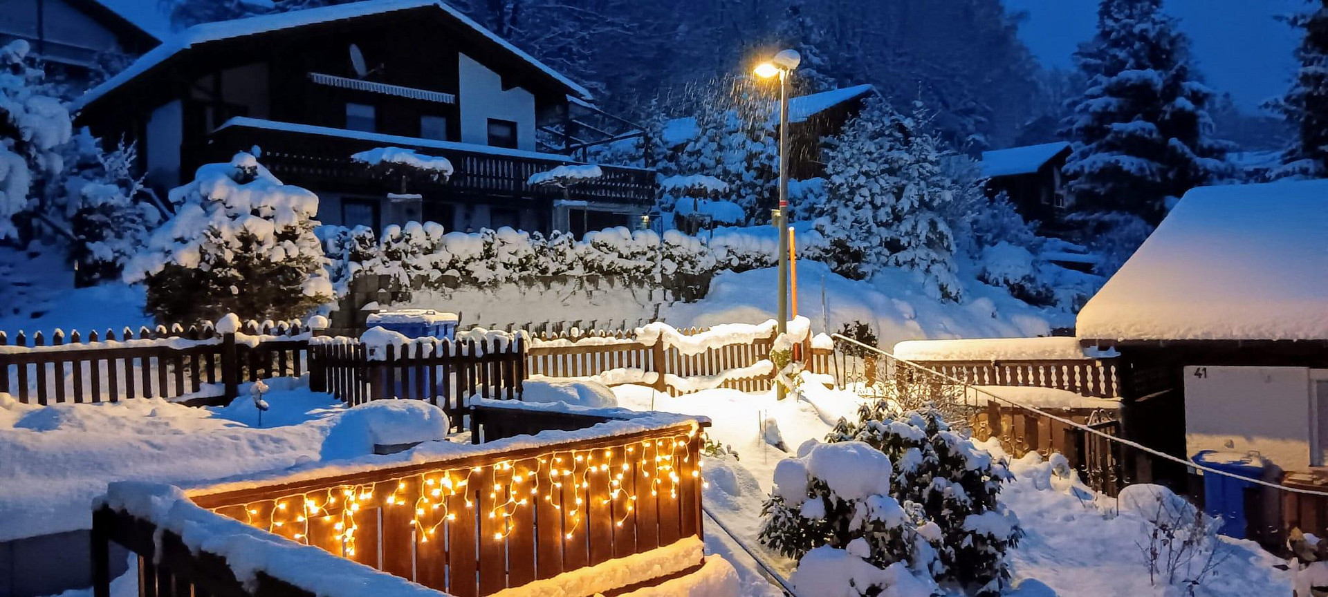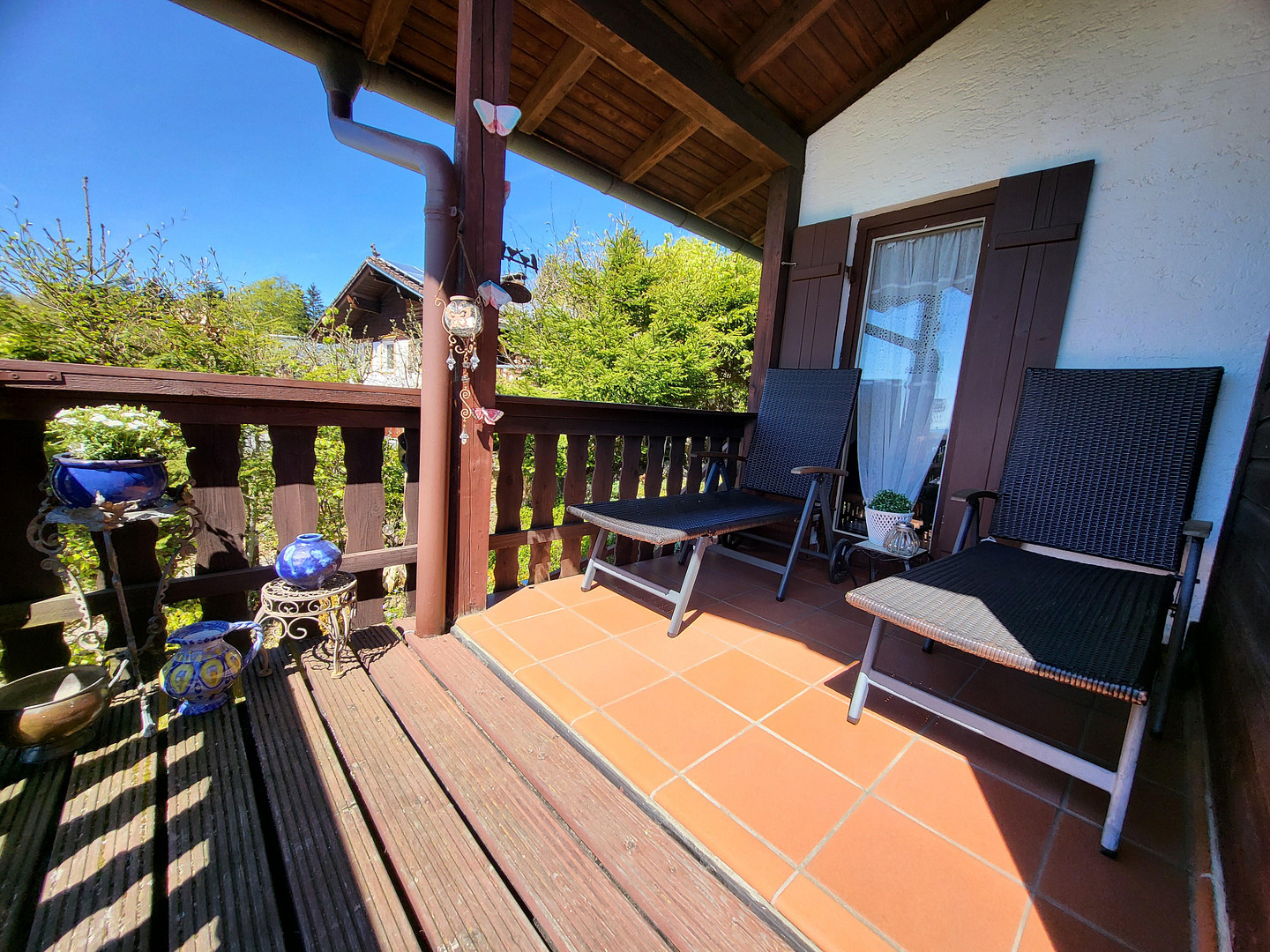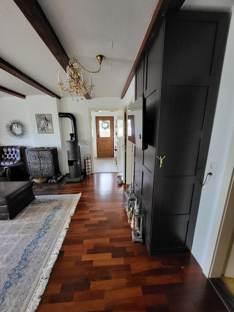 94518 Spiegelau (Oberkreuzberg) – BayernEnjoy nature-inspired living in a dream location, just outside the Bavarian Forest National Park. You can particularly appreciate the advantages of this charming hillside location while spending time on the spacious balcony: from here, you can enjoy views over the rooftops of the neighborhood and down into the green valley. This property offers a tranquil retreat, with approximately 120 square meters of living space and a distinctive, rustic charm, providing plenty of room to relax and feel at home. The living room, with its wooden parquet flooring, exposed wooden beams, and wrought-iron fireplace, is the cozy heart of the house. Here, you can enjoy a unique atmosphere and access the kitchen, which is already equipped with built-in appliances. Both rooms have access to the balcony. Two additional living areas – one on the lower floor – and two bathrooms with natural light complete the layout. The property was built in 1972 and is in well-maintained condition. Currently, it is heated primarily by two individual oil heaters, installed in 2010, with a central oil supply from three 1200-liter oil tanks. In 2021, two wall-mounted heaters were installed in the basement, but they were never used as they were not necessary. Only one wall-mounted heater in the upstairs bedroom and an infrared heater in the kitchen are used regularly because of their pleasant warmth. The house has double-glazed windows. In addition, a photovoltaic system was installed on the roof to take advantage of the sunny location. A utility room with a swinging door provides space for two oil tanks and serves as a storage area for tools of all kinds. The house is surrounded by garden areas. It's a paradise for gardening enthusiasts. In front of the house, on the south side or street side, the lawn is shaded by three willow trees, and a hedge of thuya trees provides a safety barrier to the street. The western slope, up to the main entrance on the upper floor, is planted with perennials and ground cover plants. The numerous rocks emphasize the typical character of the area. Behind the house, there is another sunny lawn with a grassy area and two fruit trees. On the east side, there is a 15 square meter covered terrace with a view of the Brotjacklriegel mountain range, another 30 square meter terrace/barbecue area surrounded by a granite wall, a small platform for our jacuzzi whirlpool, and another 3x4 meter platform with an umbrella and seating.