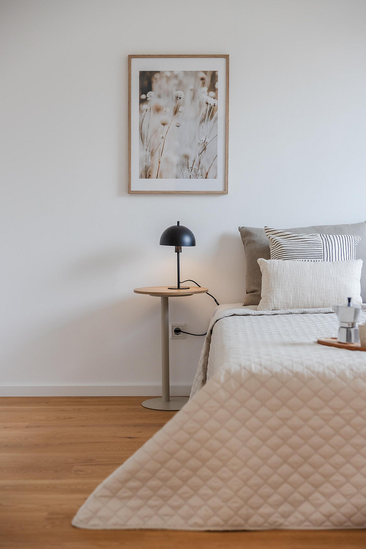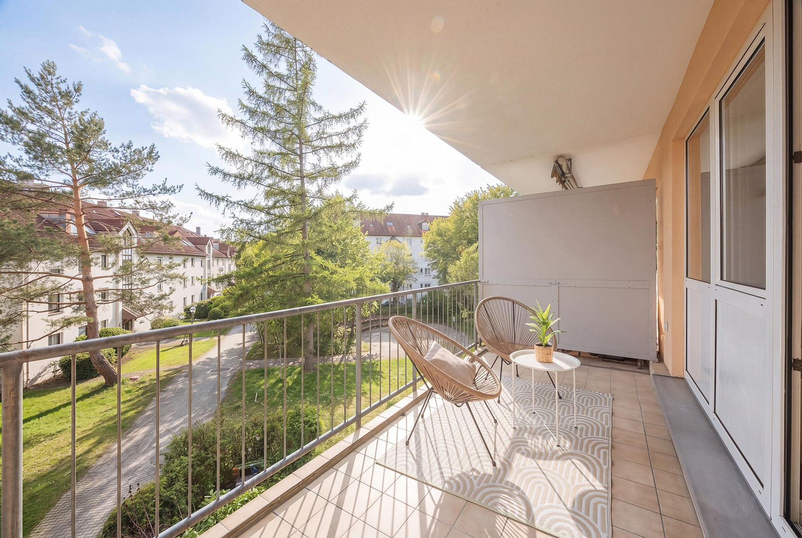 A real highlight is the large south-west-facing balcony, which overlooks a quiet courtyard. Here, you can enjoy the sun until the evening and relax after a long day.