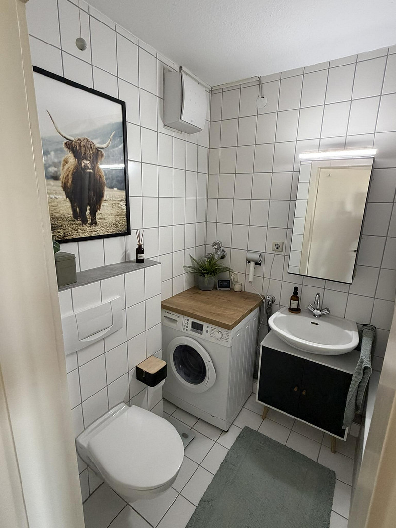 The bathroom, located within the apartment, has a bathtub and a connection for a washing machine.