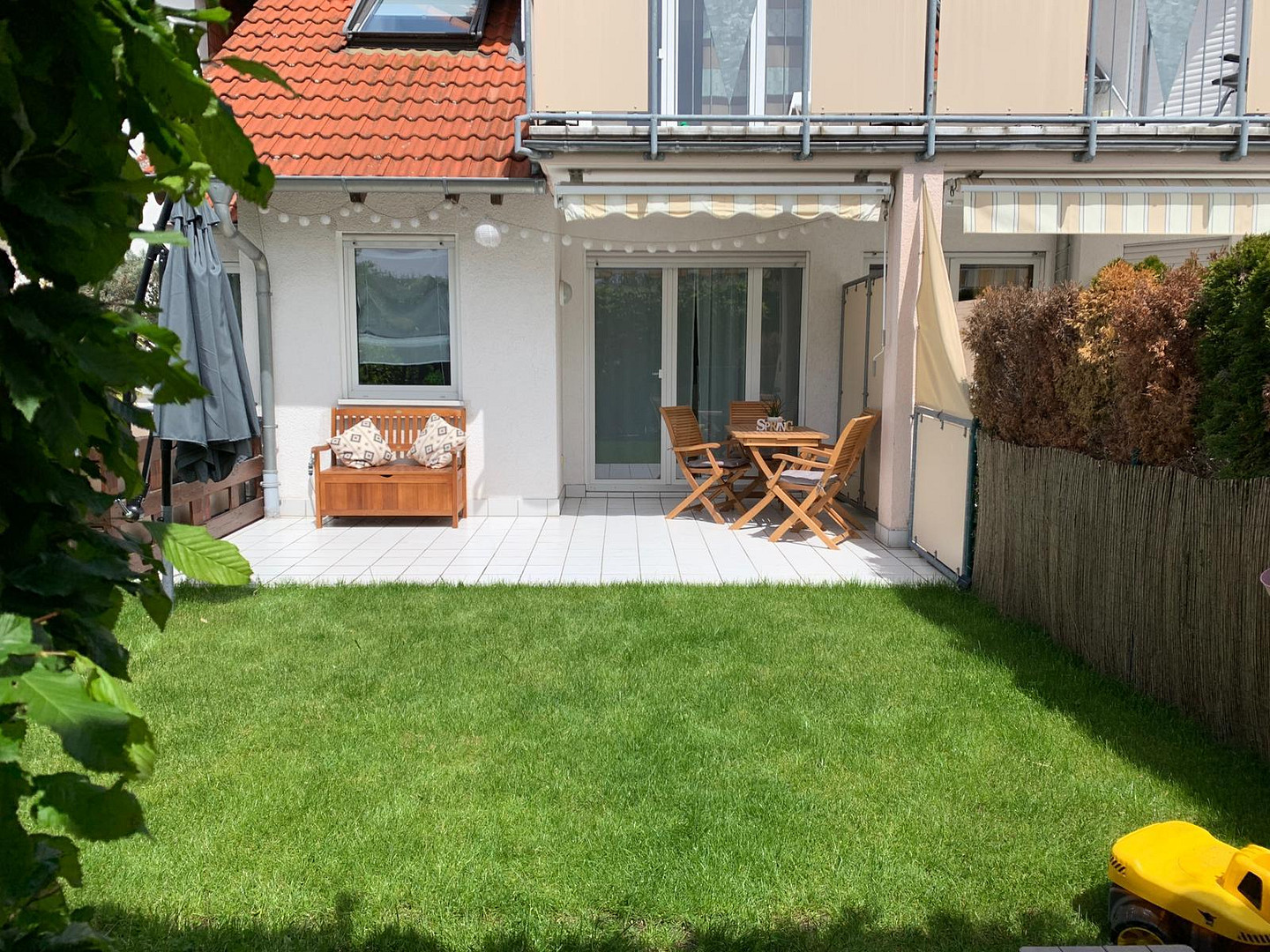 From the welcoming entrance hall, you can access the two bedrooms and the bathroom. The bathroom is equipped with a bathtub and a shower. The approximately 27 m² living room has a well-designed layout that guarantees a practical separation into a living and dining area. From here, you have direct access to the garden and the south-facing terrace, which is partially covered. The fitted kitchen (partially furnished apartment) also overlooks the spacious garden. All rooms have underfloor heating, which can be regulated individually for each room.
