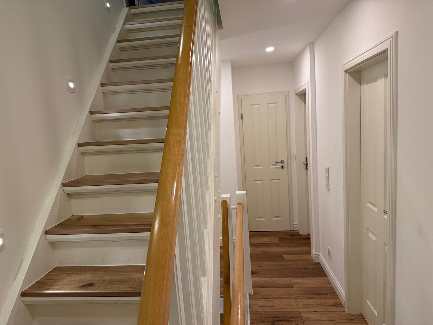 Several power sockets are integrated into the countertop. An electric fireplace creates a cozy atmosphere. Additionally, there is an exhaust duct to the garden side, for example, for a portable air conditioner. The first floor has two rooms, ideal as bedrooms, children's rooms, or a study. The modern bathroom features a walk-in rain shower and electric underfloor heating. The converted attic offers flexible usage options (e.g. This property can be used as a home office, guest room, or hobby room. An exhaust duct leads to the garden side. On the ground floor, there is another bathroom with a shower. In addition, there are two basement rooms and an attic space, providing ample storage. The garden is accessible via a staircase directly from the living room. It features a spacious terrace of approximately 30 square meters, and thanks to its southwest orientation, offers sunny hours well into the evening. The house underwent a complete renovation in 2019. The exterior area was renovated in 2024.