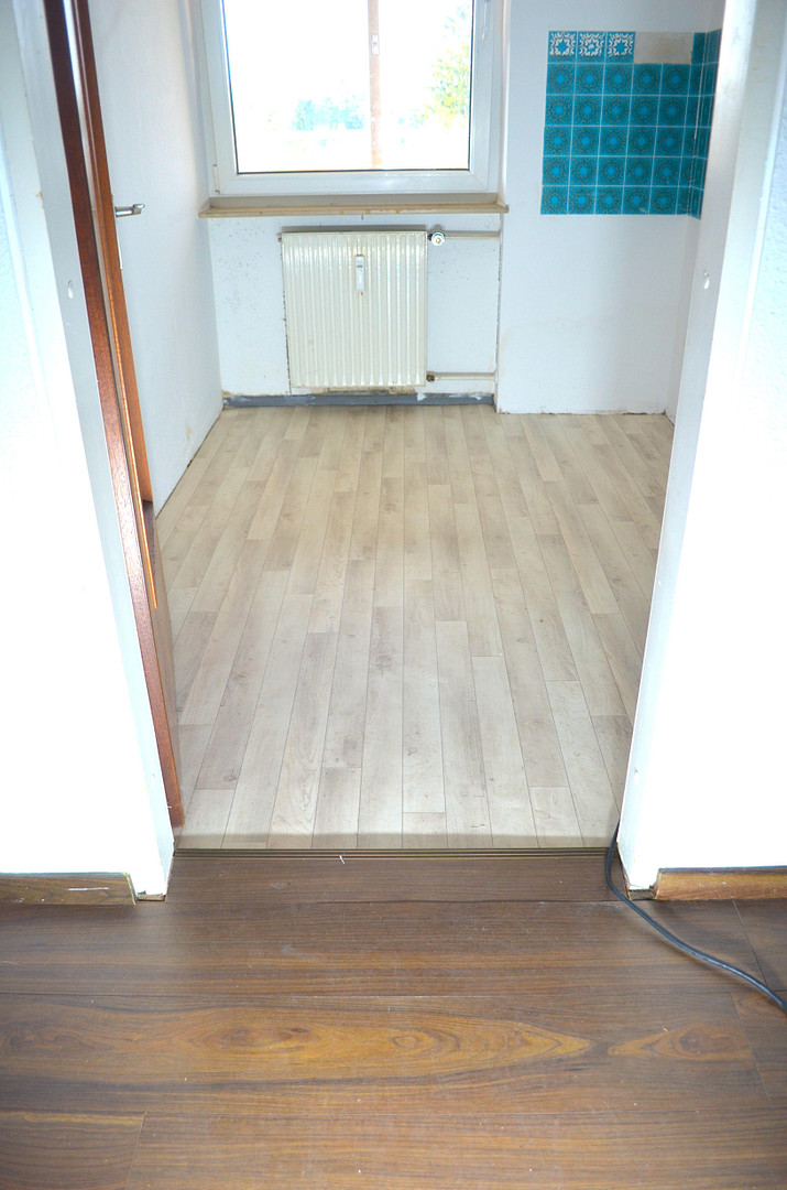 The flooring in the bathroom consists of tiles from the original construction. In the kitchen, a new PVC floor has been installed, which can also be removed. The two bedrooms and the hallway have laminate flooring, which is no longer new but could also be left in place. Replacement materials for repairs are available.