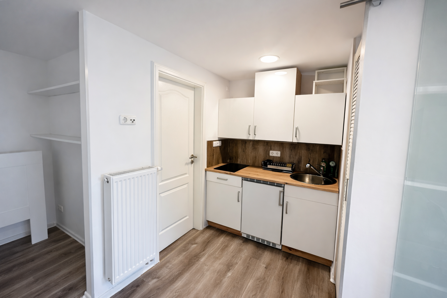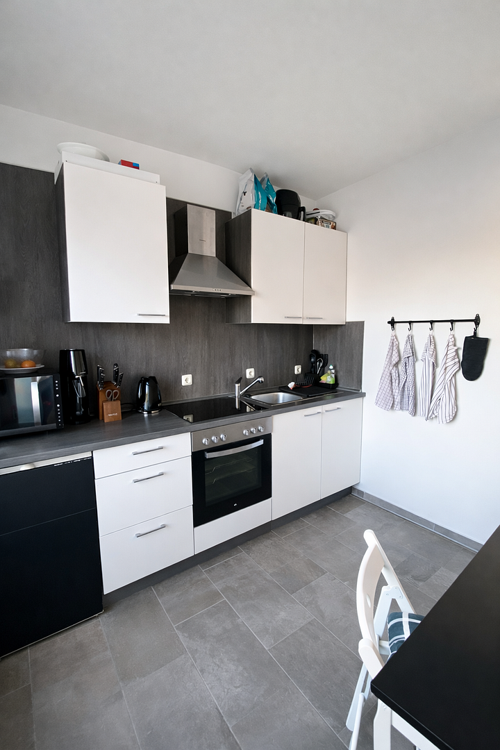 As part of the modernization, two apartments and a studio apartment were comprehensively renovated. The studio apartment was equipped in 2021 with a fitted kitchen and a shower room.