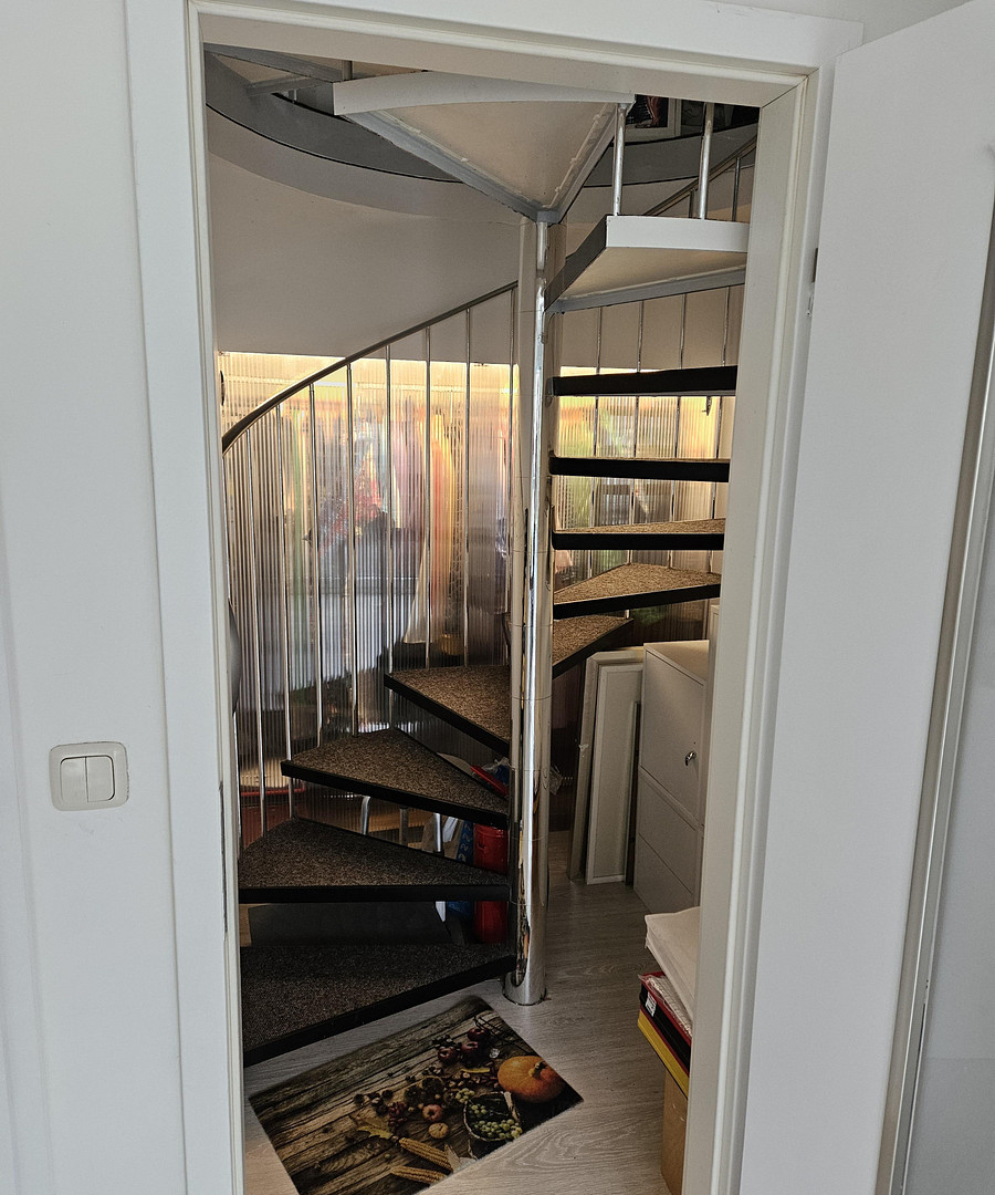 80809 Munich (Milbertshofen) – BayernUpon entering the apartment, the first impressions are of light, air, and brightness. A large, floor-to-ceiling window facing southwest floods the apartment with natural light. From the living room, you can see the large upper terrace (approximately 23 square meters) and a quiet courtyard. The upper level has a ceiling height of 2.67 meters, while parts of the lower level have a ceiling height of 2.05 meters. This maisonette apartment is located on the 2nd floor, and a spiral staircase leads to the equally bright and inviting room on the 1st floor, which also features a second terrace of approximately 21 square meters.