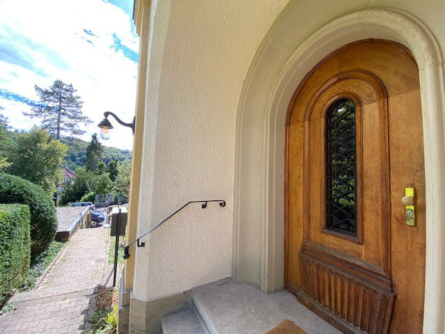 This one-bedroom apartment is located on the ground floor of an Art Nouveau villa in a prime location in Pforzheim (Vogesenallee 6, corner of Friedenstraße) and has its own entrance. The garden and courtyard can be shared.