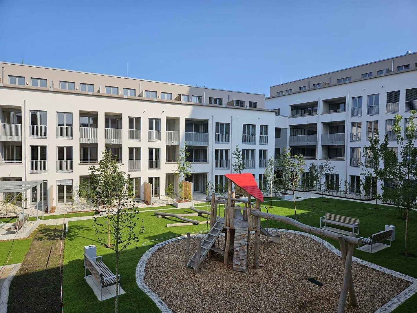- Outdoor area: Rooftop terrace with simple balcony furniture and a view of the quiet, green courtyard.