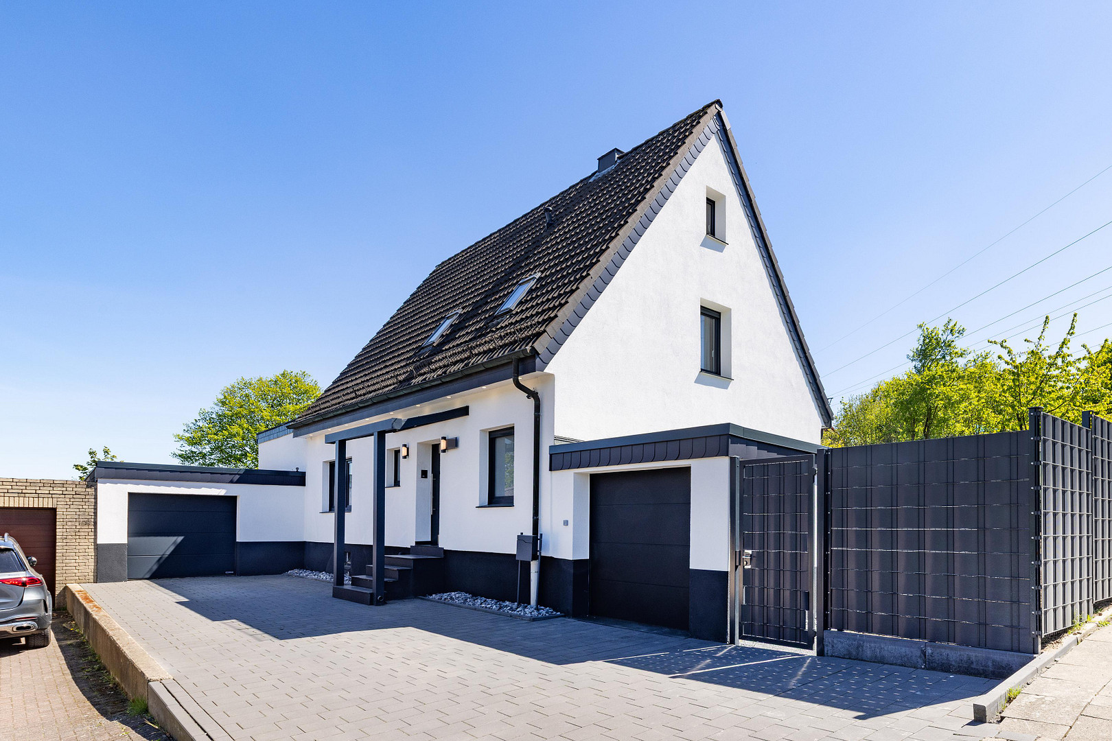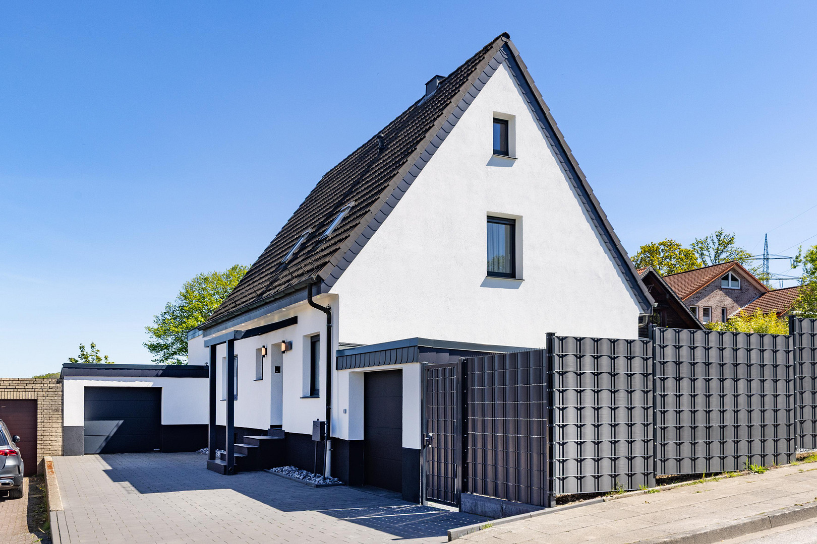 59269 Beckum (Neubeckum) – Nordrhein-WestfalenLocated in a family-friendly residential area, in a desirable location right next to the Harberg in Neubeckum, this almost-new detached house awaits you. The building was completely renovated in 2024 and is presented in a modern, inviting condition. It can be moved into immediately without any effort and offers plenty of space to realize your personal decorating ideas. Within just a few minutes' walk, you can reach the surrounding fields and forests – the perfect place to relax and enjoy nature on long walks. In addition, all important amenities are quickly accessible, ensuring a high quality of life. The spacious living and dining area forms the heart of the property. Large windows offer a beautiful view of the garden and flood the room with natural light. The clever layout separates the kitchen from the living area, creating the ideal space for convivial evenings of cooking with family and friends. Another highlight of this floor is the bedroom with its own en-suite bathroom, which is equipped with a bathtub and a floor-to-ceiling shower. A practical guest bathroom completes the offerings on this floor. The upper floor continues the pleasant and comfortable atmosphere. Two spacious bedrooms, connected to each other, and another room offer plenty of space for your individual needs. The daylight bathroom is equipped with a walk-in shower and provides additional comfort. A storage room creates valuable space and perfectly complements the upper floor. Throughout the house, modern, large-format tiles contribute to an elegant and well-maintained atmosphere. The outdoor area is distinguished by its beautiful design. The sunroom, directly accessible from the kitchen, offers a wonderful view of the well-maintained garden, which requires minimal upkeep. A fence provides privacy, while the elegant stone flowerbeds blend harmoniously into the overall picture. Two practical garages are available for your vehicles, and the driveway offers additional parking space. The full basement is also in very good condition and provides ample storage space for your belongings. The combination of high-quality finishes and an excellent location makes this house an ideal retreat for you and your family. Please contact me directly if you are interested. The sale is commission-free!